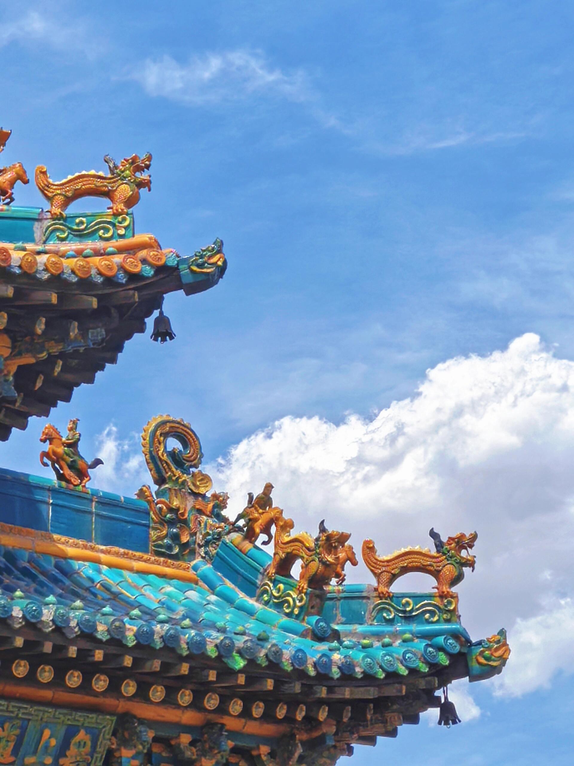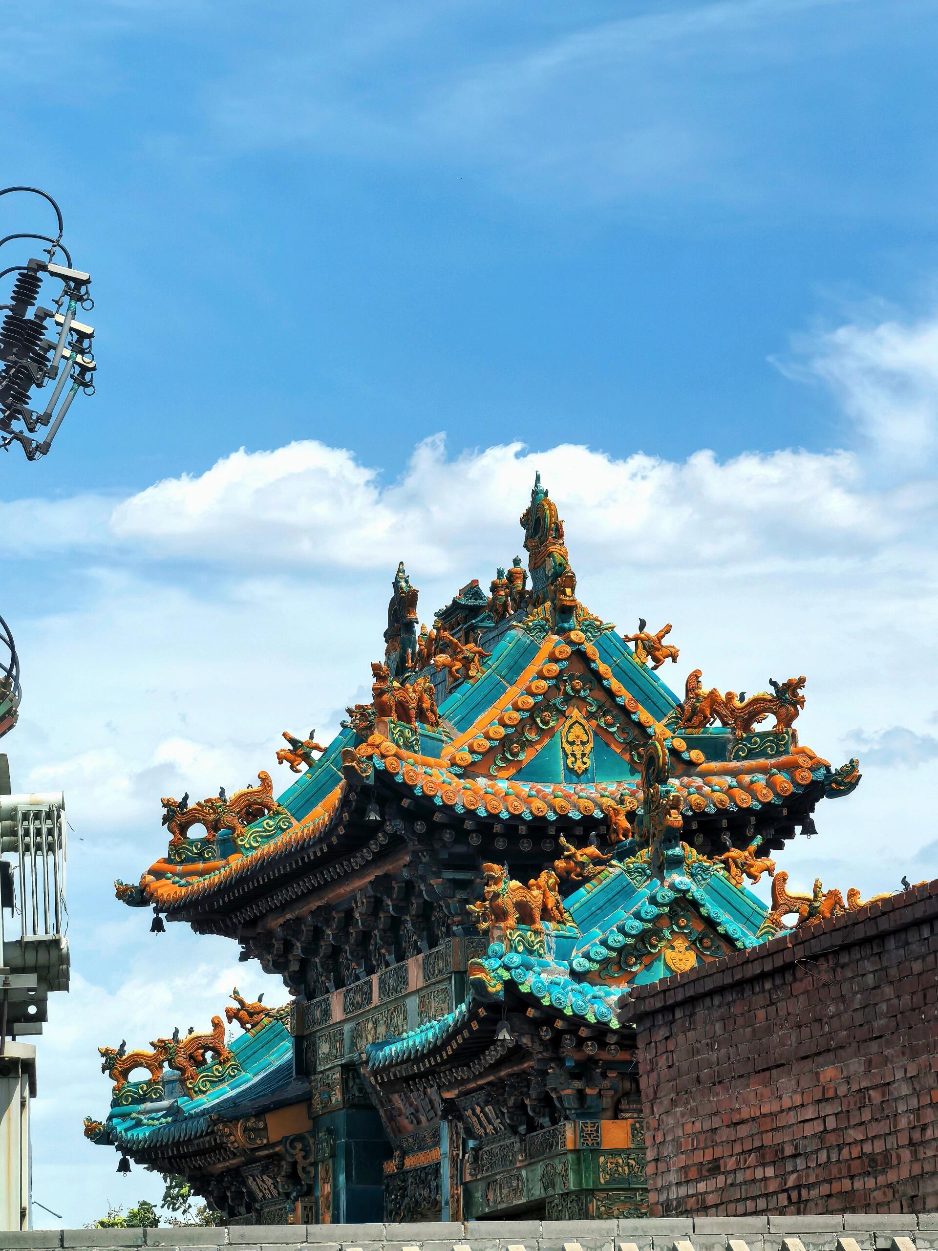 整座牌楼最震撼之处,在于琉璃装饰的运用。除基座外,几乎每一寸表面都被琉璃覆盖。黄、绿、蓝为主色调,白、紫、黑、绛等色穿插其中,尤其是罕见的孔雀蓝琉璃,在阳光下泛着神秘幽光,与明艳的黄、绿形成强烈对比。这些琉璃釉色并非随意堆砌,而是严格遵循传统色彩美学,黄色象征皇权与尊贵,绿色寓意生机,蓝色则暗合道教"道法自然"的理念。