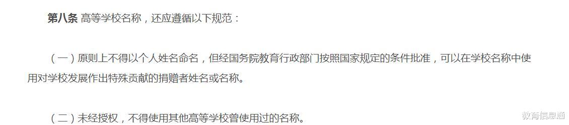 此次公示,学校仍然是申报更名为仲恺农业工程大学。这里就有一个问题,根据2020年8月教育部发布的《高等学校命名暂行办法》的规定,原则上不得以个人姓名命名,但经国务院教育行政部门按照国家规定的条件批准,可以在学校名称中使用对学校发展作出特殊贡献的捐赠者姓名或名称。