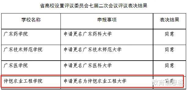 早在2015年,广东省高评委就同意其更名为仲恺农业工程大学并公示,同一批公示更名大学的广东药学院、广东技术师范学院、广东医学院均先后完成更名,唯独仲恺农业工程学院未完成更名大学。十年时间过去了,学校再次迎来更名公示,在这十年时间学校取得了发展进步,省教育厅高度重视,在今年8月学校相关负责人表示:“学校更名大学事项已被列为广东省教育厅头号工程”。