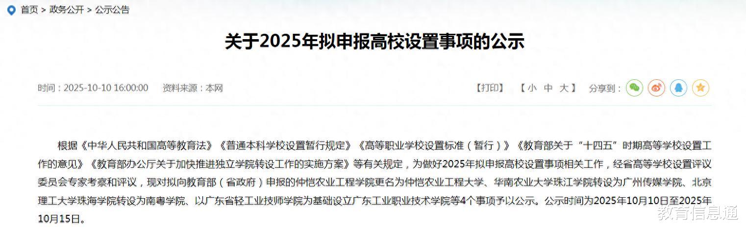 10月10日,广东省教育厅官网发布《关于2025年拟申报高校设置事项的公示》,拟向教育部申报设置4所高校,其中仲恺农业工程学院申报更名为仲恺农业工程大学。