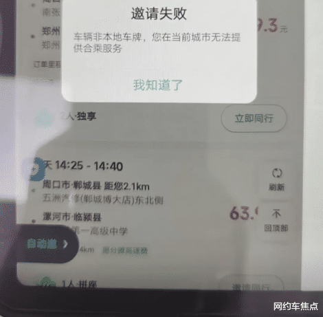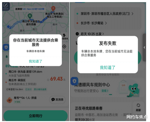 最近不少车主反映,在郑州、周口、深圳等地打开某顺风车 APP 接单时,会直接跳出 “车辆非本地车牌,在当前城市无法提供合乘服务” 的弹窗,外地车牌根本接不了单。