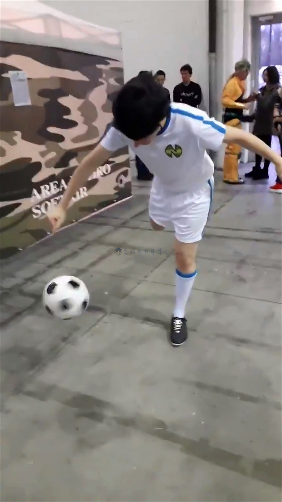 呃,铺垫到这里差不多了,博士今天写了这篇文章,说明我看到了值得分享的作品。一位昵称为“Ryo Saeba”的网友在社群里发了一个COS作品,突然火了起来!而这个作品其实出自2019年某个线下互动中,一位意大利小伙穿着足球运动服,摆出了射门的姿势,最为精彩的地方在于:他的前面有一个处于空中、旋转的足球。仿佛下一刻,他就能把处于绝佳位置的足球射出去,破门得分。