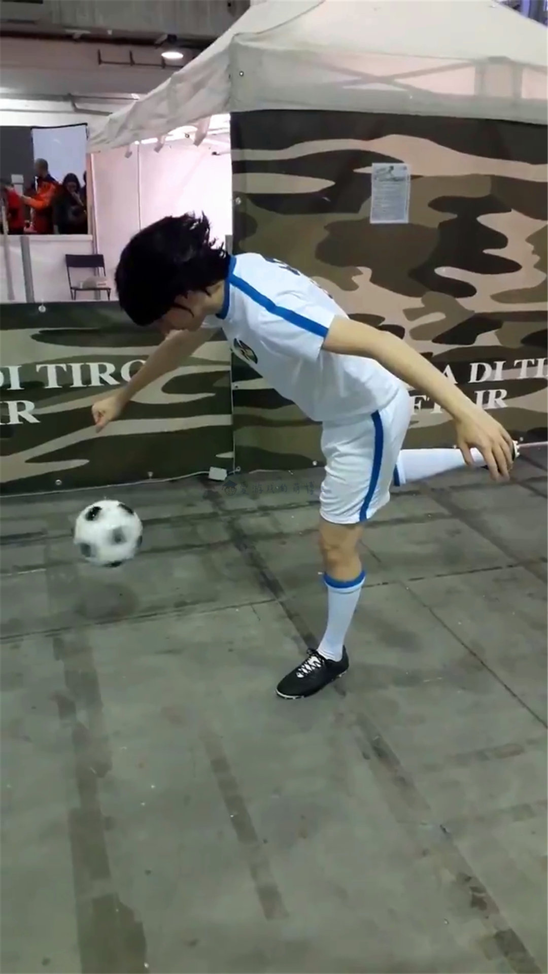 这一幕,看过《足球小将》的人应该都非常熟悉,动漫里经常会出现上述这种射门定格画面,主人公一方面耍个帅,另一方面经常在这一瞬间展开回忆,然后踢进致胜的一球。意大利小哥通过成本极小却精巧的道具(足球上弄了绳子)就搞定了《足球小将》里的一个名场面,挺有创意的,让博士想到了泰国低成本小哥(Lowcostcosplay),路数一样。
