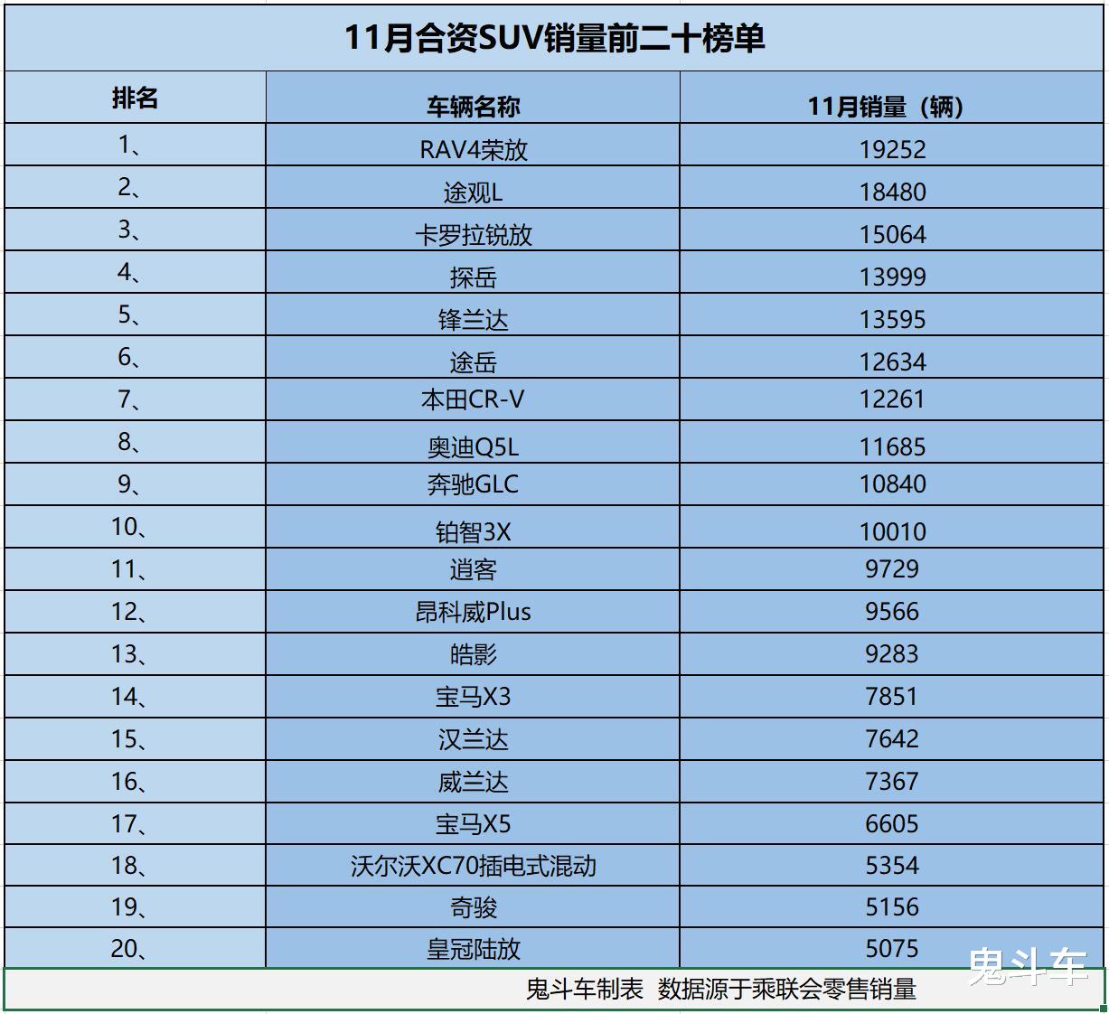 这样的趋势,在销量上体现得更为明显,近日,乘联会发布11月零售销量数据,鬼哥整理出11月合资SUV销量排名前二十榜单,榜单上,共有10款合资SUV车型销量过万,跟之前的火爆局面相比,势头还是明显下滑,接下来,看看具体车型排名与销量表现。