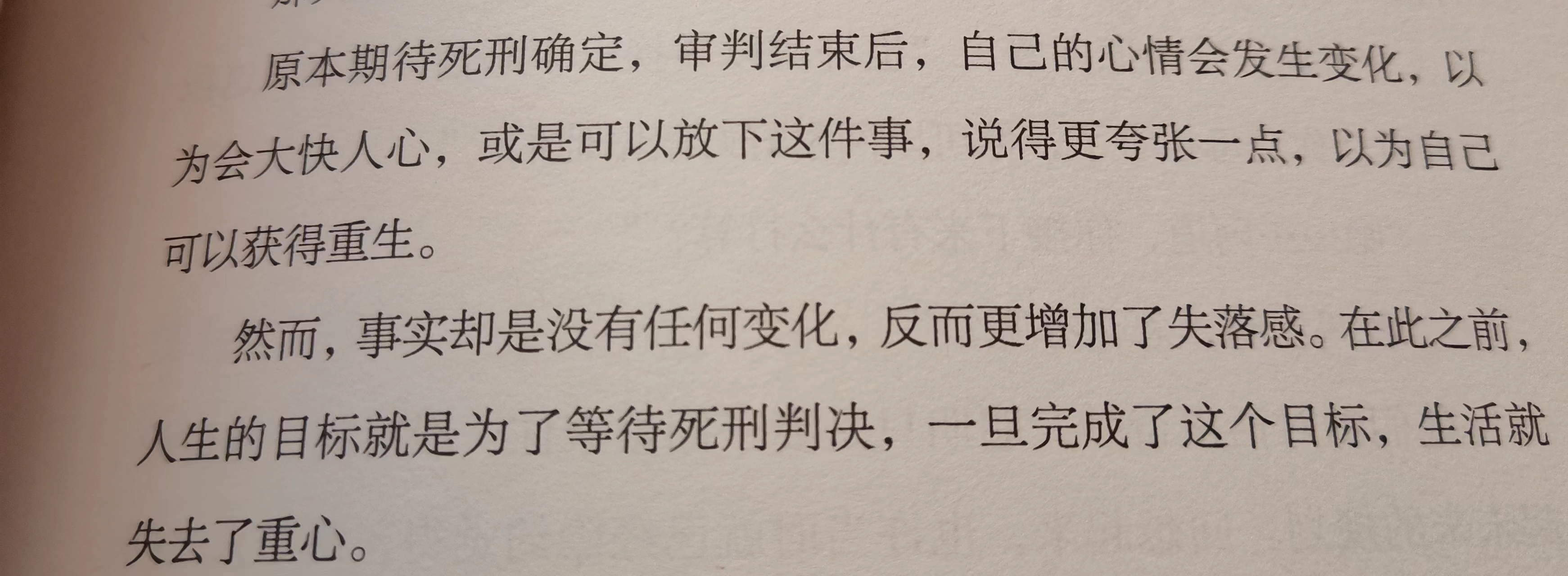"原本期待死刑确定,审判结束后,自己的心情会发生变化,以为会大快人心,或是可以放下这件事,说的更夸张一点,以为自己可以获得重生。然而,事实却是没有任何变化,反而更增加了失落感,在此之前,人生的目的就是为了等待死刑判决,一旦完成了这个目标,生活就失去了重心。"