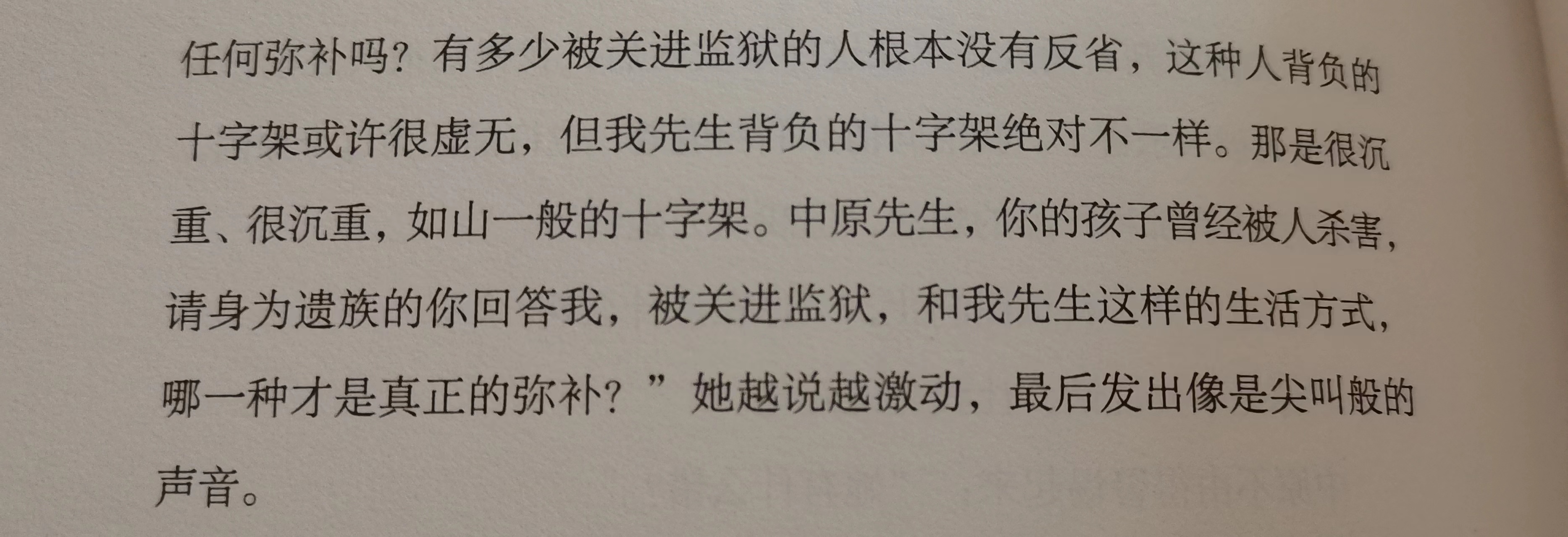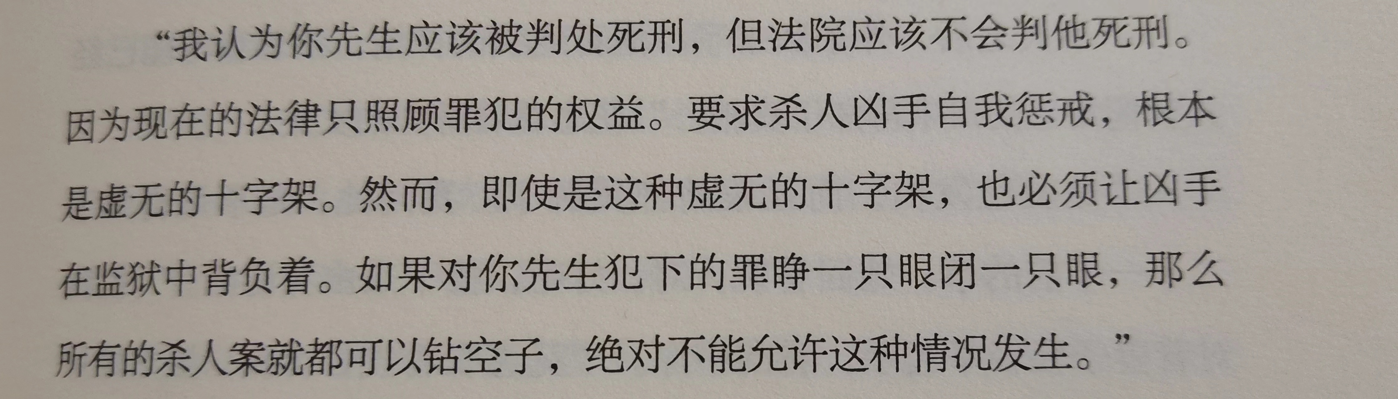 "要求杀人凶手自我惩戒,根本是虚无的十字架,然而,即使是这种虚无的十字架,也必须让凶手在监狱中背负着。"