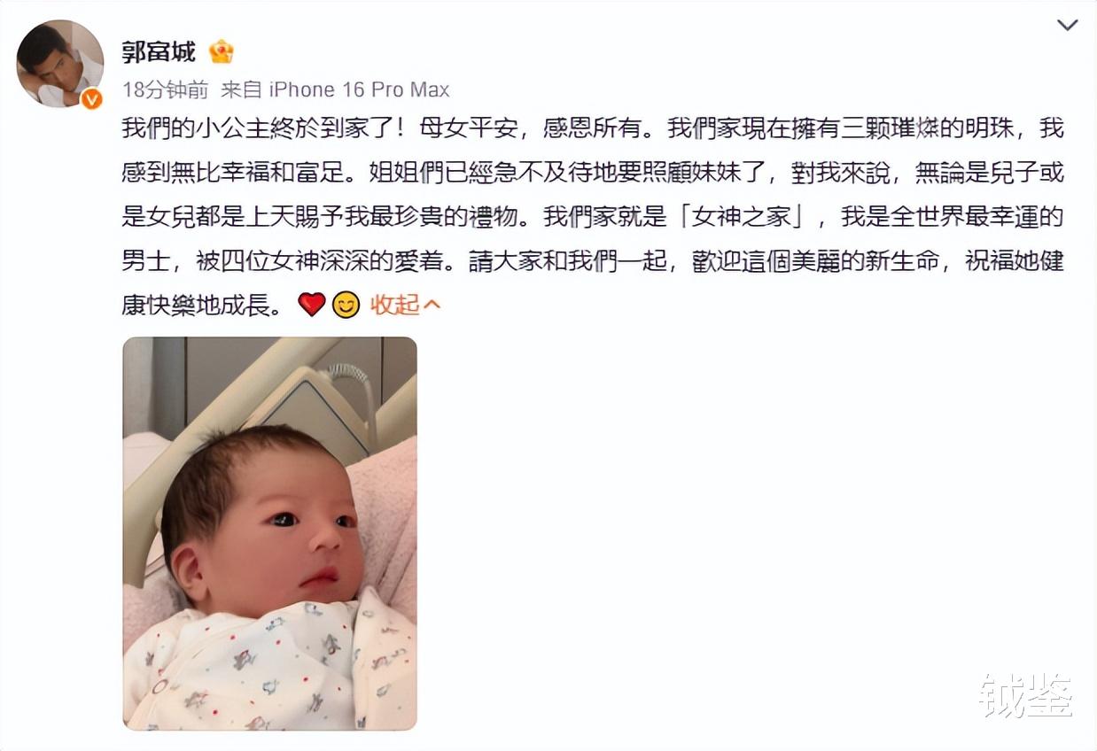 之后郭富城带着岳父岳母和孩子回了豪宅,全程都没看到方媛。但很快郭富城就公开发文,表示三胎还是女儿,家里已经有4位公主了。