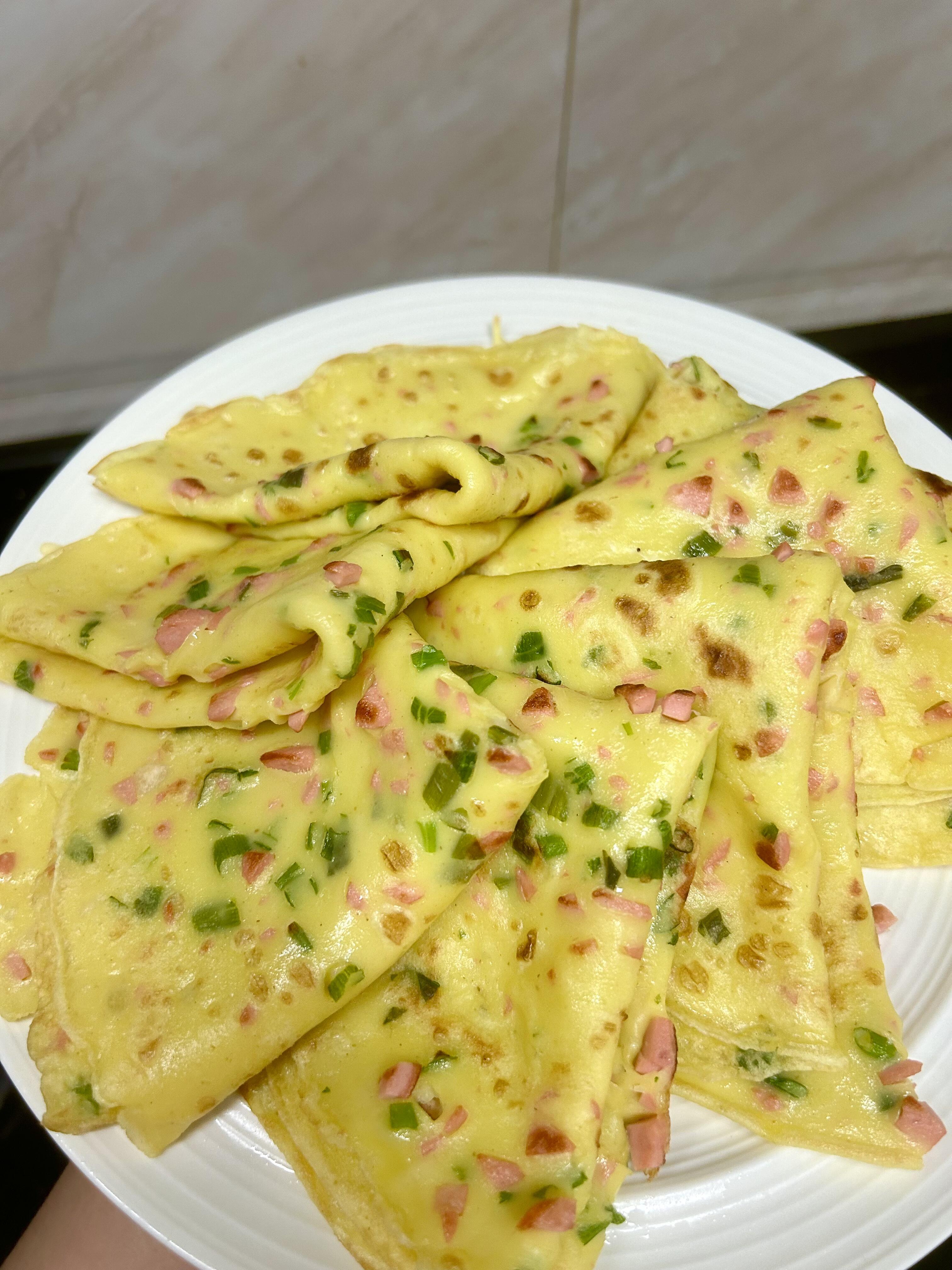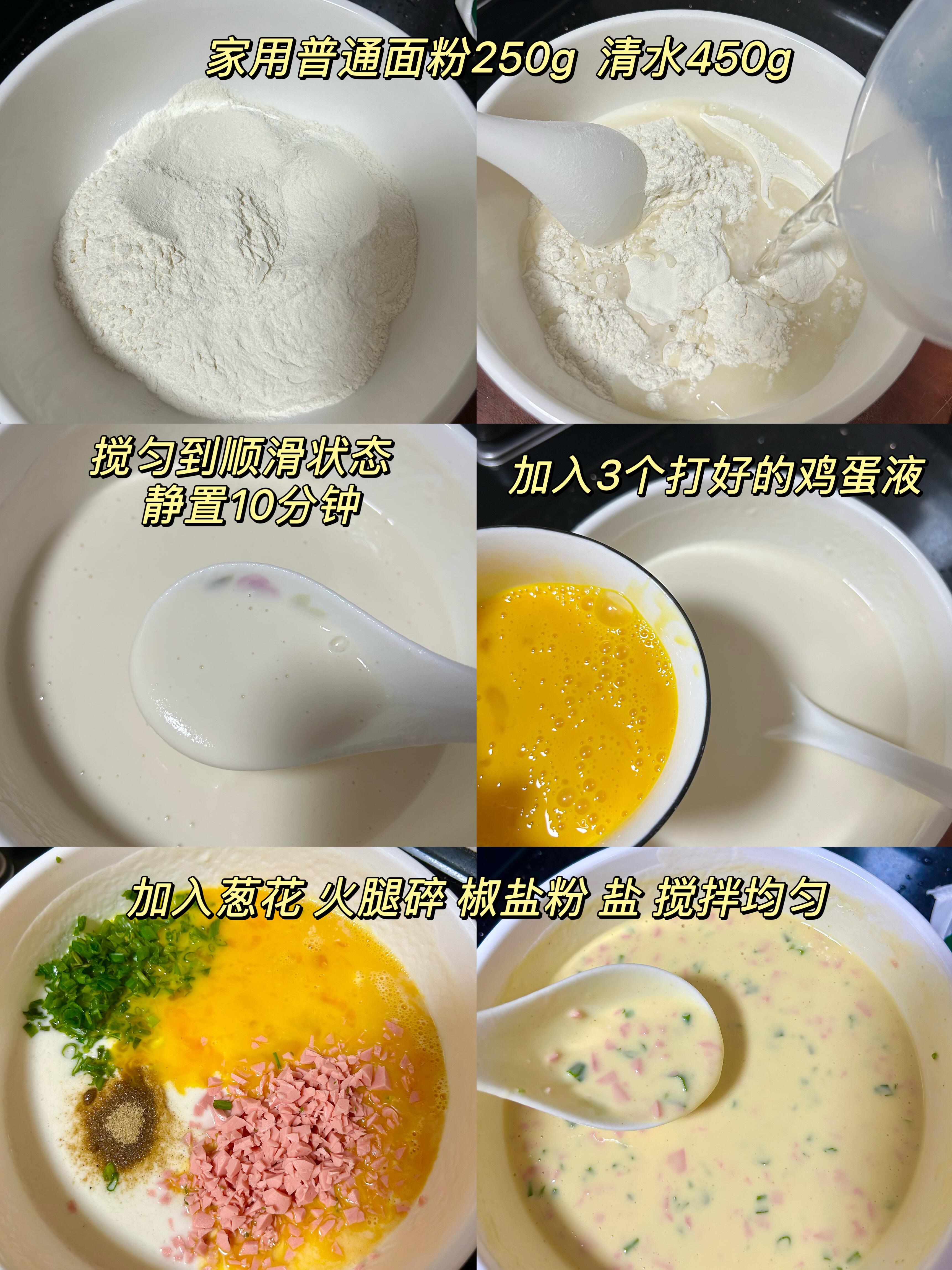 • 懒人秘诀:火腿丁别切太大,1cm左右的小块更容易和面糊融合,摊饼时不会“戳破皮”。