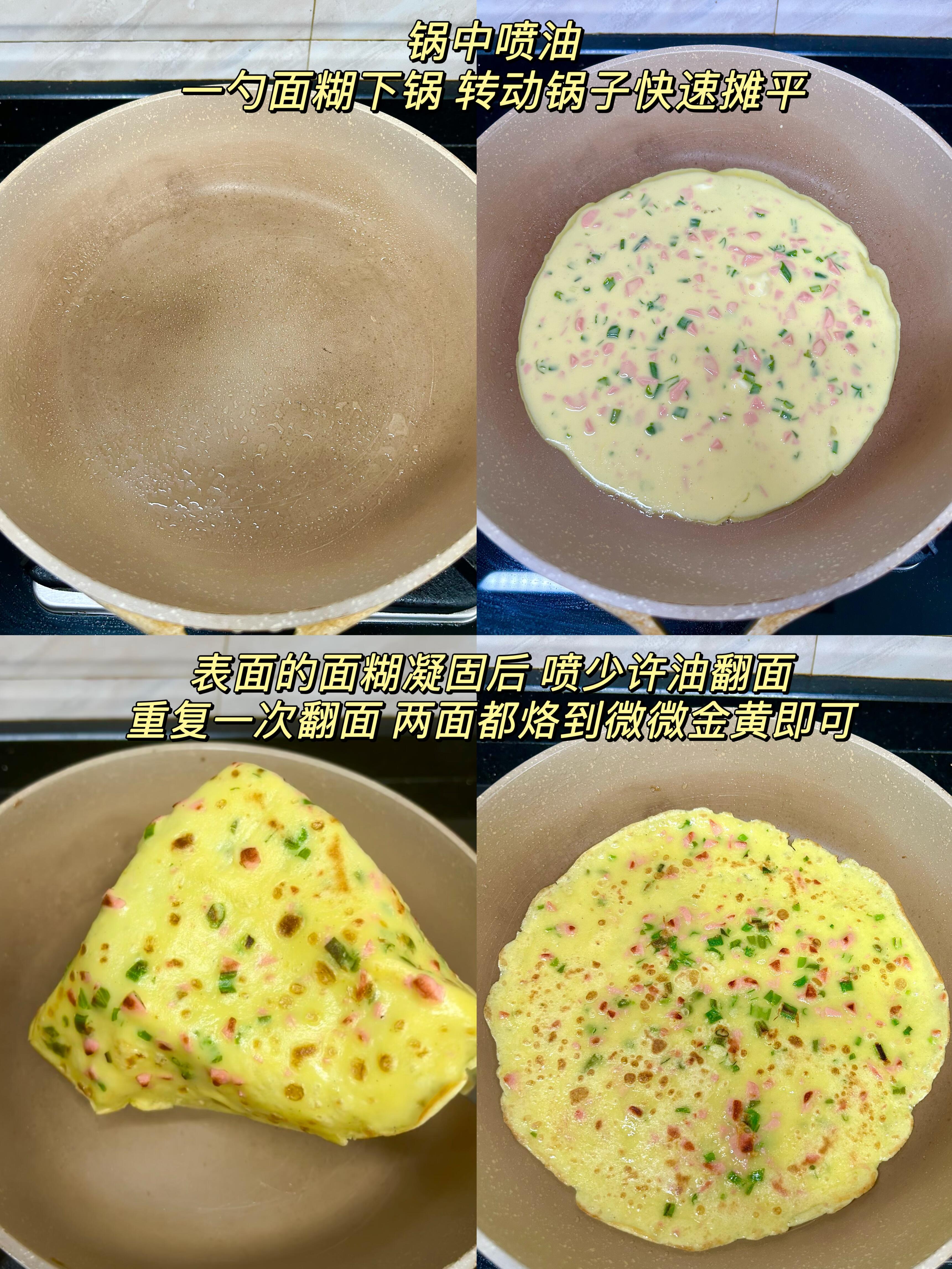 3️⃣ 摊饼:全程小火!手速要快!