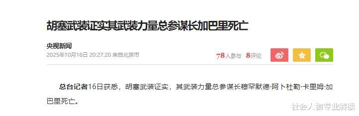 根据央视新闻报道,当地时间10月15日,也门胡塞武装已经证实,也门胡塞武装总参谋长穆罕默德·阿卜杜勒·卡里姆·加巴里已经死亡。但是奇怪的是,并没有公开说明总参谋长的死亡具体时间、地点、原因,只是强调其在作战岗位上“殉职”。想想看这么高的职位,不可能上一线战场去抛头露面,况且也门胡塞武装与以色列相隔1000多公里,不可能打地面战。