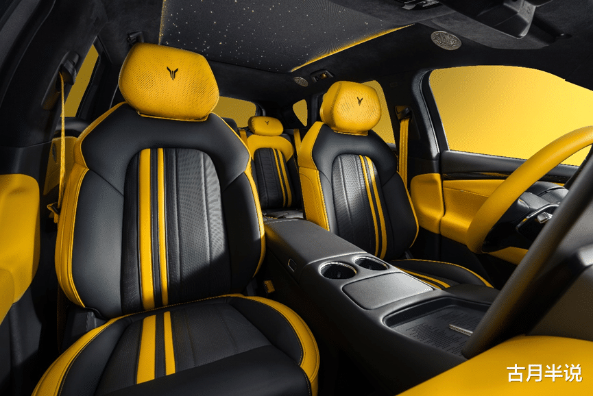 内饰:撞色激情,碳纤轻奢座舱内饰以玄金双拼色调为主,仪表台、方向盘等区域采用黄色超纤包覆,搭配仿麂皮顶棚与NAPPA运动座椅,兼顾触感与支撑性。暗影哑光碳纤维组件覆盖多處细节,提升座舱质感。可选智慧星空顶,支持语音控制十二种模式与十四色分区星光,融合驾驶激情与浪漫氛围。