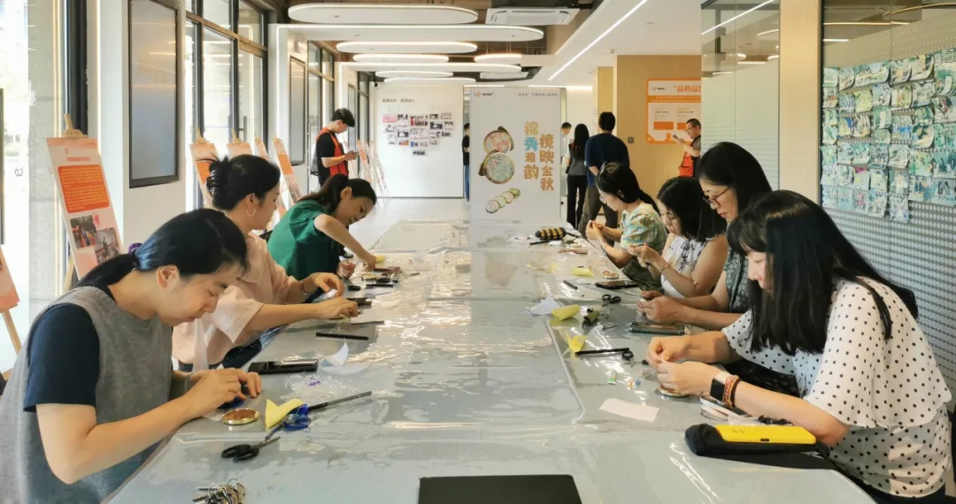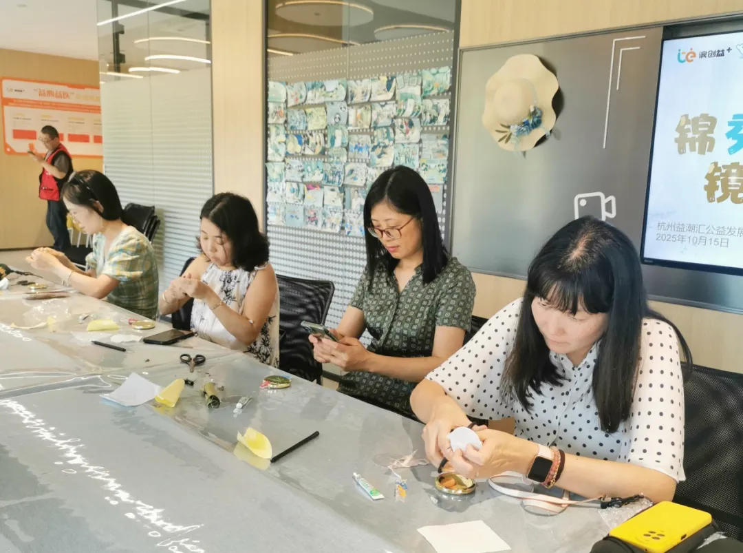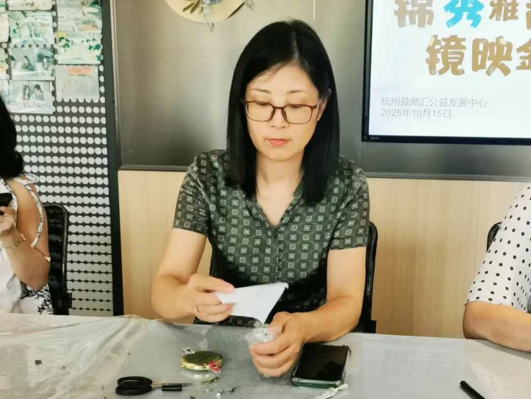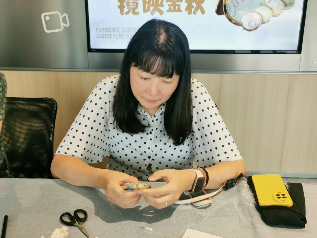 10月15日下午,在“滨创益+”综合服务阵地内,一场以“锦绣雅韵,镜映金秋”为主题的宋锦装饰镜手作体验活动温情开展。志愿者们在秋日暖阳中,用巧手匠心,将璀璨的“金秋”定格于方寸镜框之间。