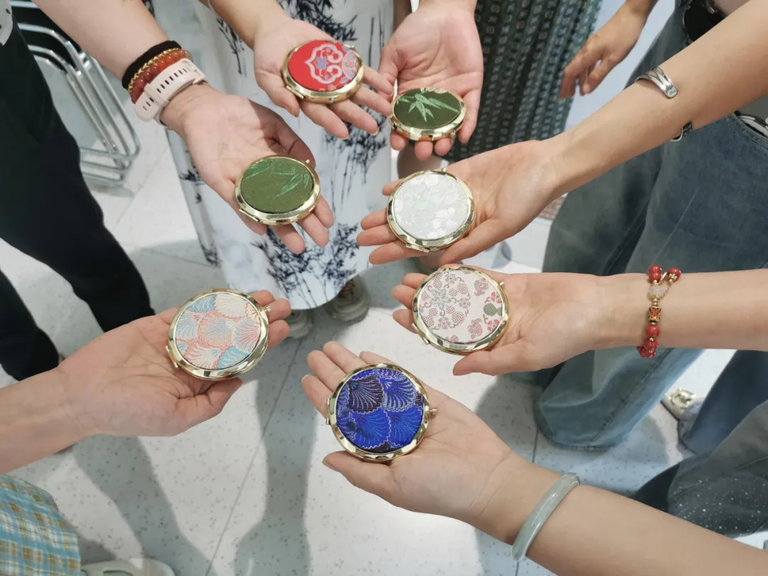 在互帮互助的氛围中,原本普通的材料在大家手中渐渐蜕变。当古朴华美的宋锦与光洁的镜面严丝合缝地结合,一件件独一无二、典雅别致的宋锦镜子制品便诞生了。成品有的典雅大方,有的精巧别致,宋锦独特的纹理在光线下泛着柔和的光泽,镜中映出的,是志愿者们欣喜的笑脸。
