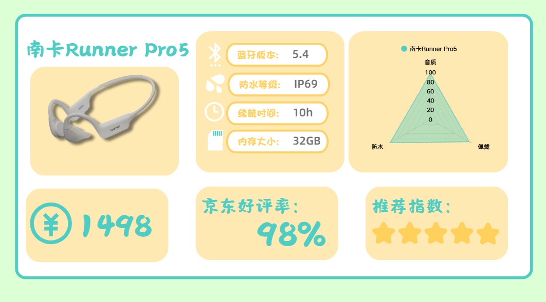 作为骨传导耳机领域的头部品牌,南卡凭借多年声学研发积累,不断突破核心技术。这款Runner Pro5定位旗舰级,集高音质、轻盈佩戴、顶级防水性能于一体,是目前少见的全能型运动耳机。无论是跑步、骑行、健身还是游泳,都能稳定适配,性价比极高,深受运动爱好者青睐。