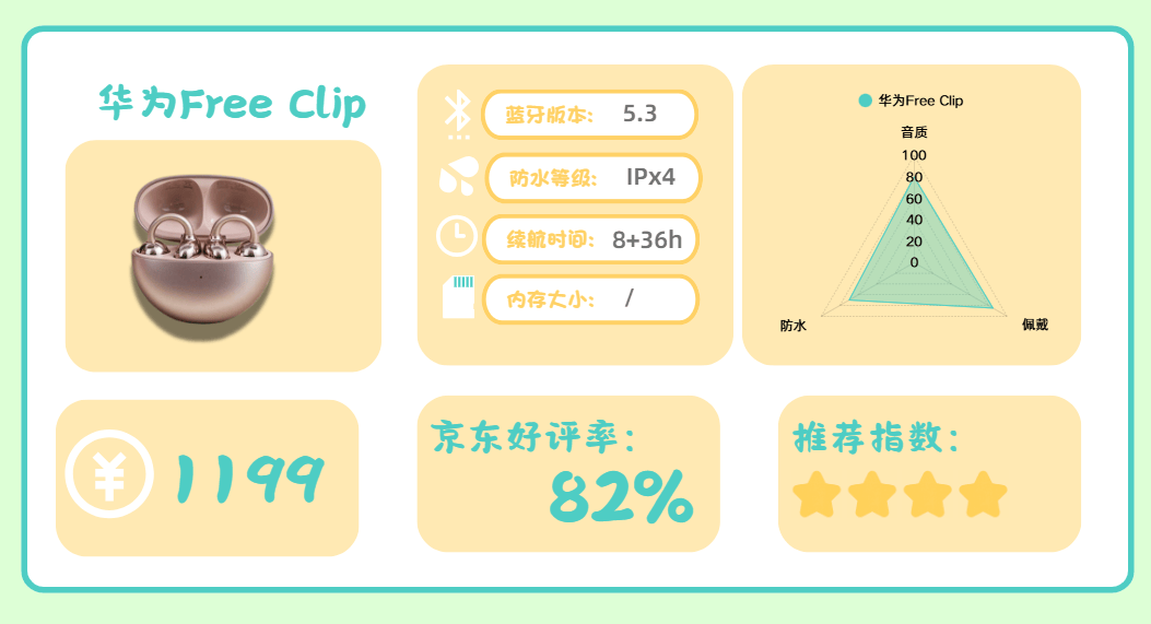 华为 FreeClip 以极具辨识度的“天鹅颈”造型与创新的C 桥结构脱颖而出,支持盲戴设计,佩戴便捷。机身经过上万次弯折测试,在弹性与稳定性之间取得平衡,既保持轻盈贴合,又能在日常运动中稳固不移,适合追求个性外观与舒适佩戴的通勤与运动用户。