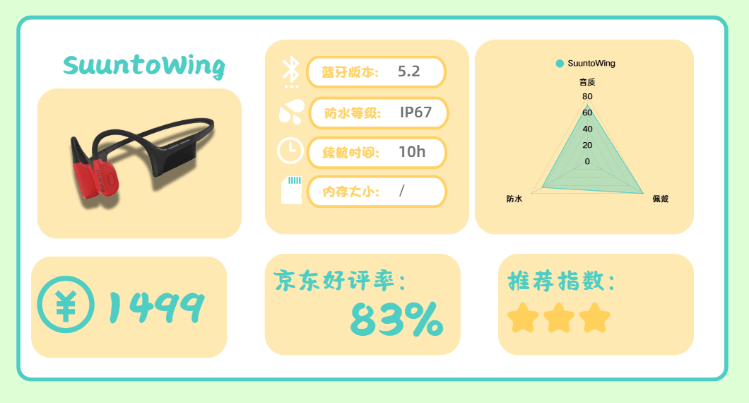 Suunto Wing 搭载低音增强声学技术,在低频下潜与冲击感上有明显提升,播放节奏感强的曲目时能带来更澎湃的听感。人声与高频表现偏中性、延展一般,不过整体调音偏向加强低频、增强运动场景下的听感体验,更适合喜欢动感音乐和需要节奏感驱动训练的用户。