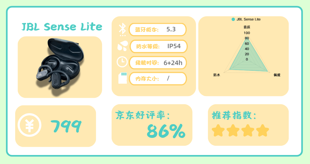 JBL Sense Lite 主打多佩戴场景与个性化舒适体验,支持挂耳式 + 夹耳式双模佩戴,搭配开放式声学架构,在不封闭耳道的同时提供相对私密的听音体验。设计兼顾稳固与轻盈,适合跑步、通勤、健走等需要环境感知的场景,尤其适合不喜欢入耳异物感但又追求音质表现的用户。