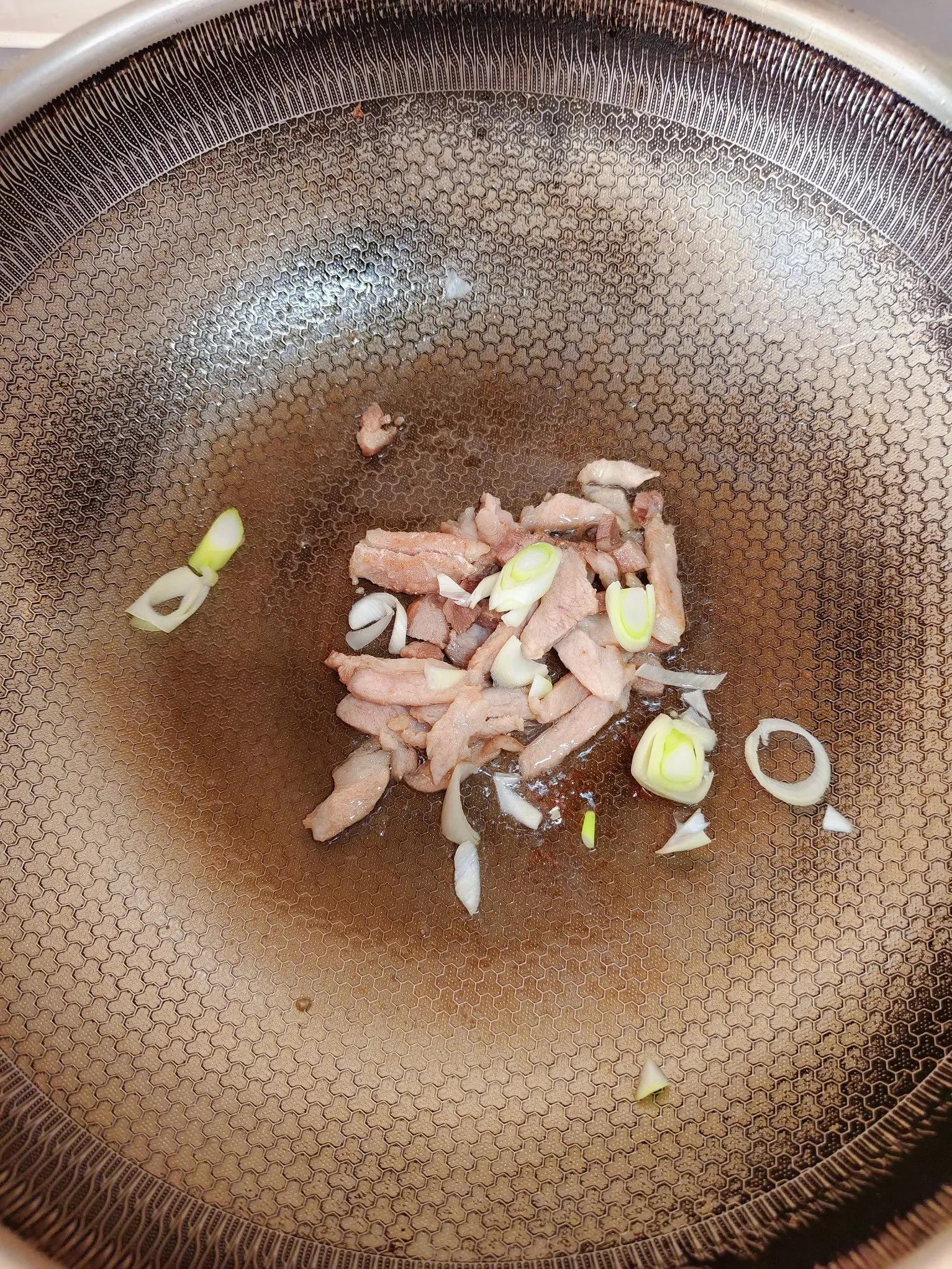 2、锅里倒入食用油,加入切好的肉,翻炒几下,炒至焦黄,加入葱花,炒出香味。