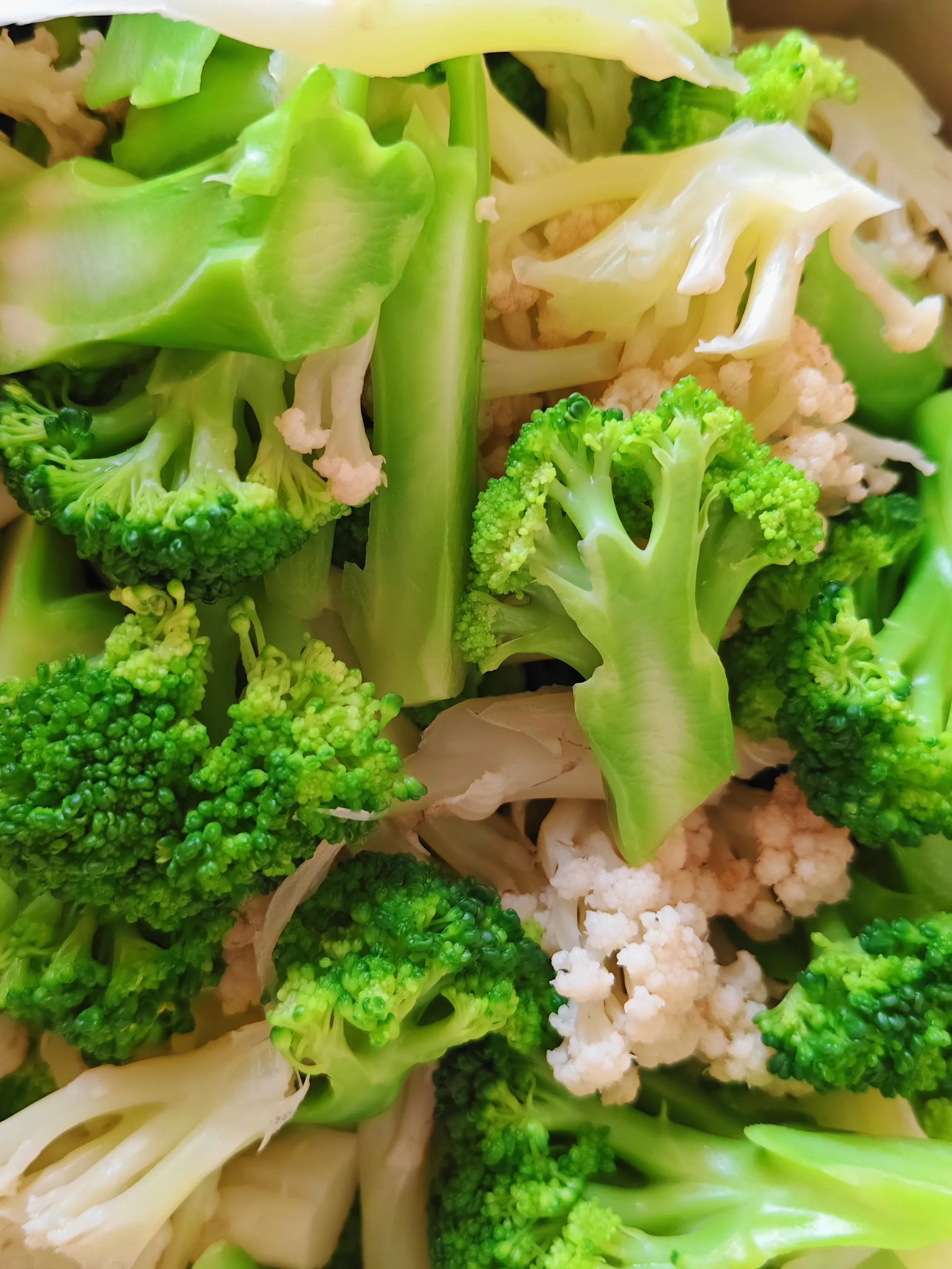 1、将西兰花和菜花分开洗净,锅里倒入清水,水开倒入处理好的西兰花和菜花,水开煮两分钟左右捞出,过凉水备用。