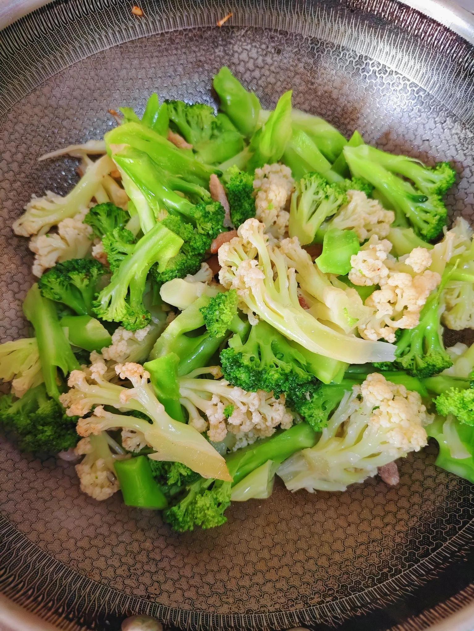 3、加入焯水的西兰花和菜花,翻炒几下,加入盐、味极鲜调味。