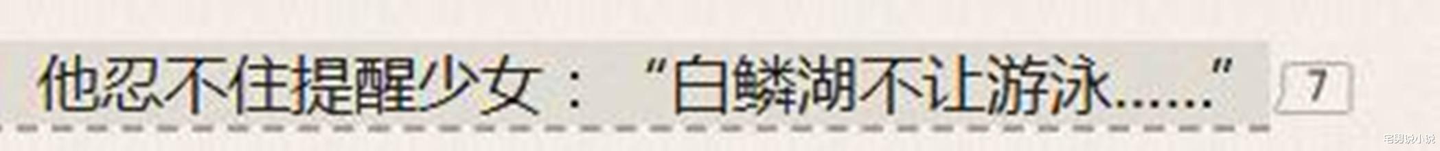 ‘白鳞湖不让游泳’这几个字看起来平平无奇,感觉就是在提醒人的话,可是结合主角所在场景,慢慢品,忽然发现其有深意,哈哈。