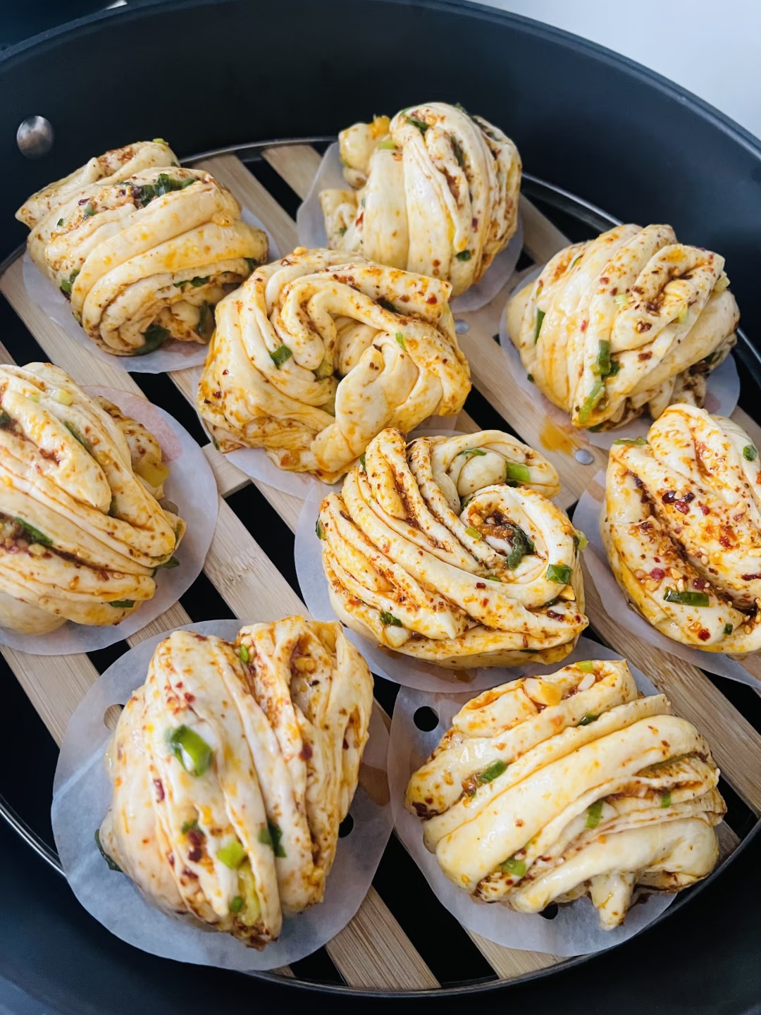 揭开蒸笼的刹那,氤氲白雾裹挟着葱香扑面而来。层层叠叠的翡翠螺旋在雪白面皮上舒展,金黄葱花与火红辣椒碎宛如点缀其间的宝石,在蒸汽中若隐若现。这盘刚出锅的香辣葱油花卷,正用热腾腾的香气讲述着一个厨房新手的逆袭故事。
