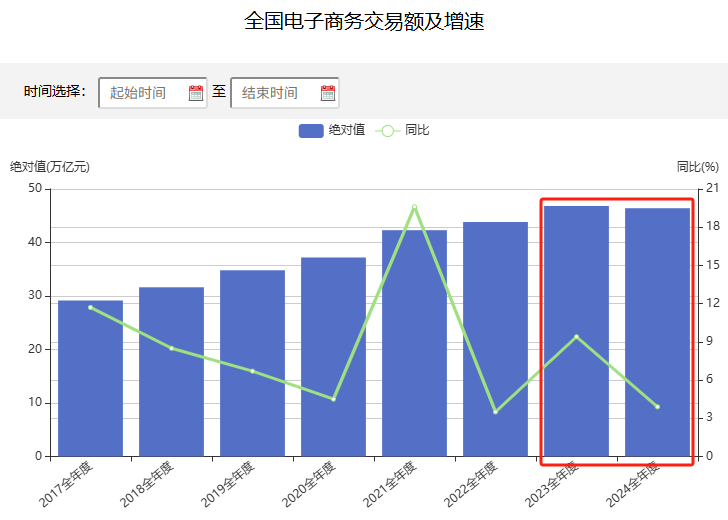 更大的背景是:线上零售市场或逐步触及增长天花板。据国家统计局数据,2023年、2024年,全国网上零售额分别是15.4万亿元、15.52万亿元,同比增幅分别是11%、7.2%;其中,全国电子商务交易额分别是46.8万亿元、46.41万亿元。