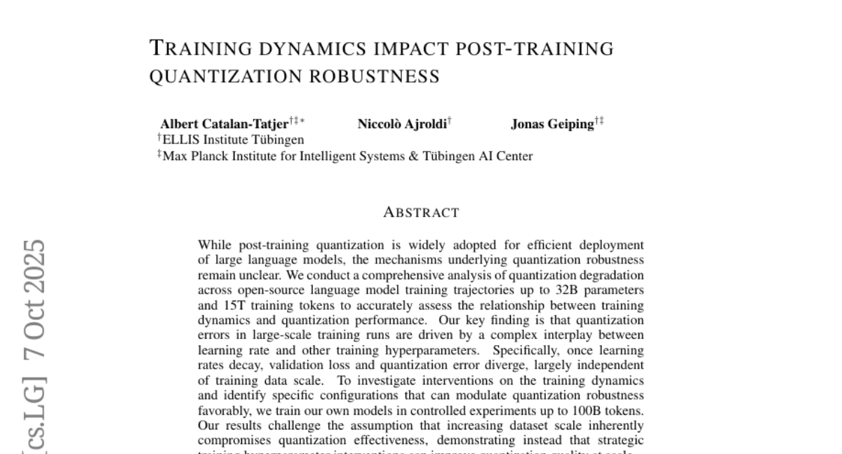 但ELLIS研究院团队的最新发现彻底颠覆了这一认知。他们发现,影响量化效果的主要因素并非训练数据规模,而是训练过程中的动态变化,特别是学习率的调度策略。这个发现就像突然意识到,影响MP3压缩效果的不是音乐类型,而是录制时使用的设备和设置。