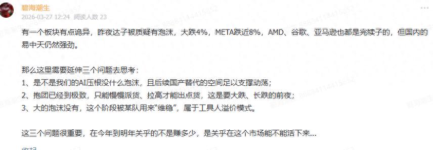 上周抛出的一个疑问,通过这几天的观察可以得出一个阶段性结论: 目前还是有业绩支撑,年报和一季报向好是支撑CPO板块不倒的重要原因,但已经不便宜,局部开始有泡沫但远小于美股那边的,但因为,目前也是极度抱团,市场风险偏好持续收窄,因此短期会呈现出机构减持其他股去买CPO的现象,大致就是卖2买1的程度。至于什么时候要注意CPO板块的资金分流,以4月下旬做为时间窗口,如果同时叠加4月中前其他股大跌后,伊朗局势进入缓和,那么就得小心。