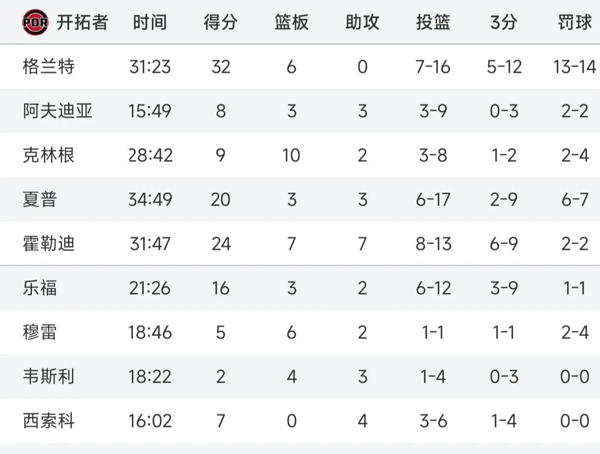 数据方面,格兰特拿到32分,夏普拿到20分,霍乐迪24分。
