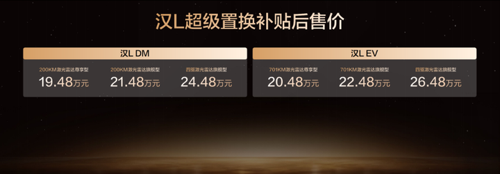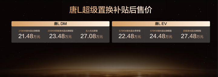 此次,汉L EV 3款车型,超级置换补贴后售价20.48万~26.48万元;汉L DM 3款车型,超级置换补贴后售价19.48万~24.48万元;唐L EV 3款车型,超级置换补贴后售价22.48万~27.48万元;唐L DM 3款车型,超级置换补贴后售价21.48万~27.08万元。同时,比亚迪还为用户准备了包含置换补贴在内的至高价值5.2万元(汉L)/4.5万元(唐L)尊享礼遇。(以上权益截至12月31日)