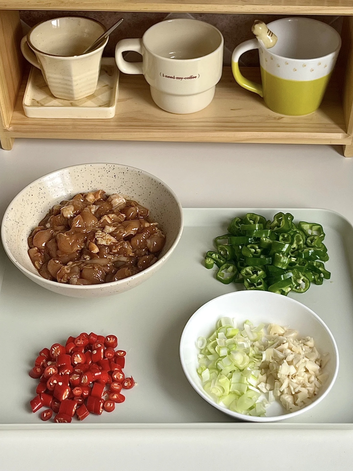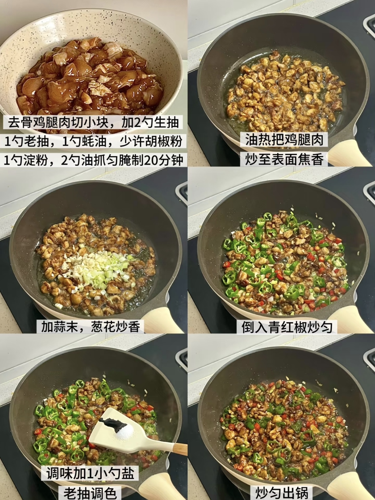· 懒人版:鸡腿肉去皮切块,直接下锅生炒(更香!),但需要掌握火候
