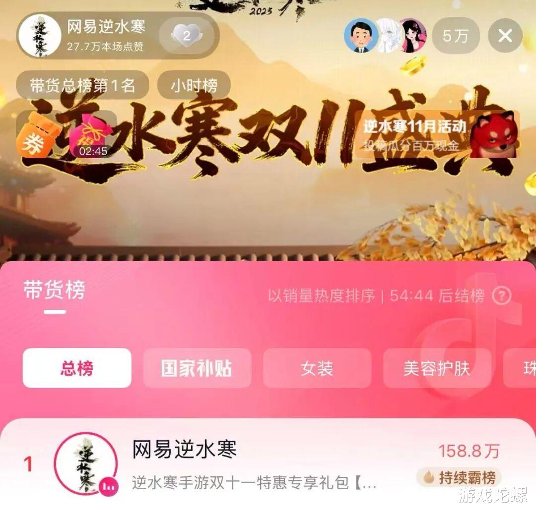 实际上,《逆水寒手游》这两天惹人注目的新动作不仅是上线国际服,今天(11月8号)的抖音直播带货,《逆水寒手游》刚开播不久就空降带货总榜第一名。