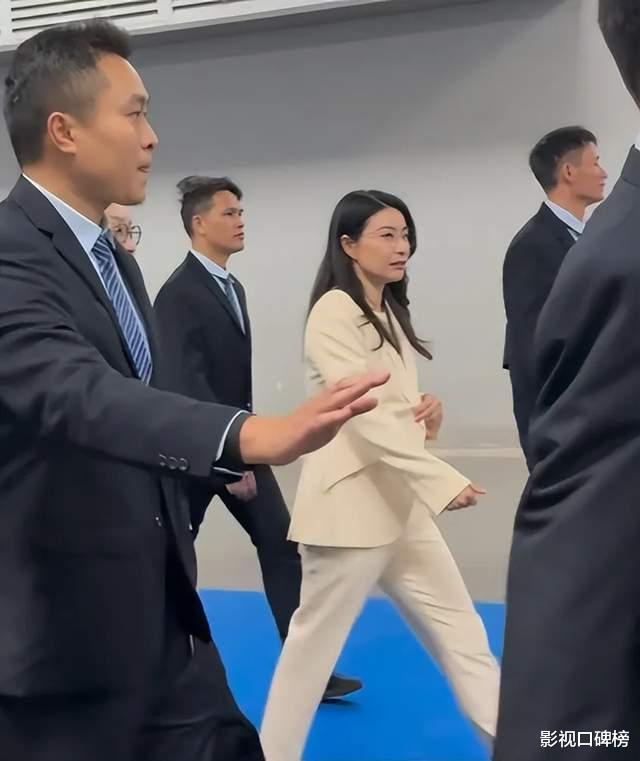 最瞩目的是当然是昔日“跳水女皇”郭晶晶。她穿着一身白色西装,简约又干练,一头长直发披散着,看上去很柔顺,平时很用心打理。还戴着眼镜,她的眼睛近视很深。郭晶晶脚上踩着高跟鞋。一身的打扮显得很高,身材纤瘦。
