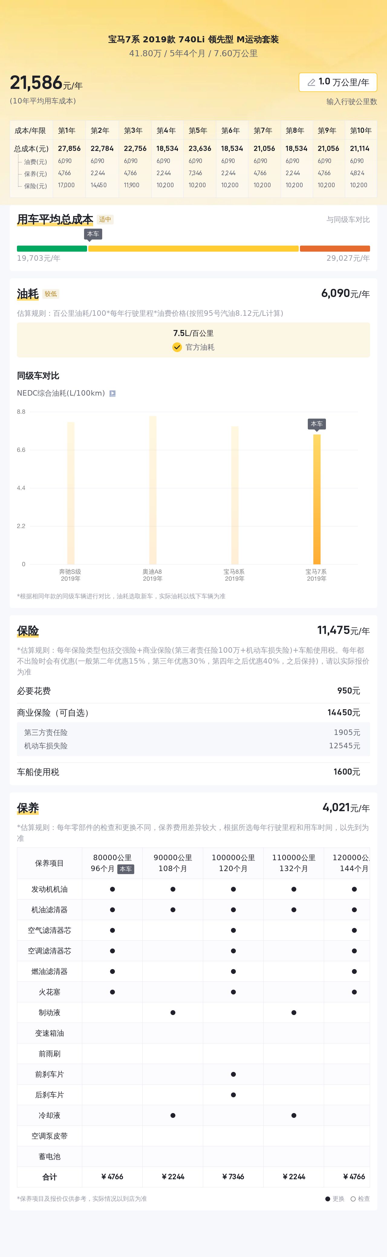 说完这辆车的配置,咱们说说这辆车的用车成本,这辆车的油耗为7.5L/百公里,按照每年行驶一万公里里程计算,燃油费用约为6278元,年度商业保险约8487元,每年保养费用约7078元,平均年度用车总成本约21843元,以上数据仅供参考,实际用车成本因用车场景和个人用车习惯而有所不同。