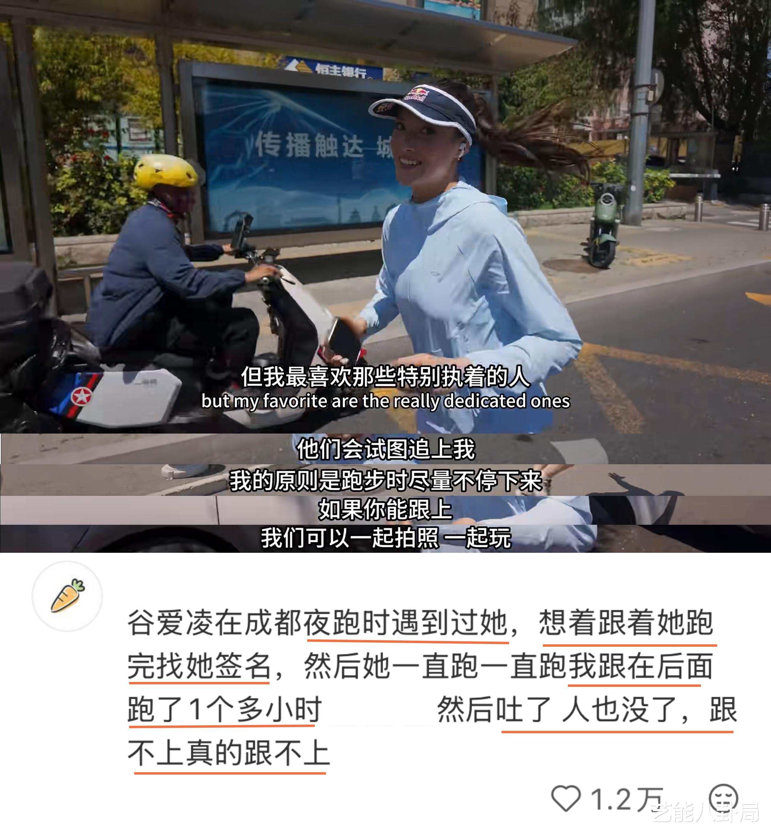搞笑的是,还真有网友在评论区现身说法——说夜跑时遇见过谷爱凌,为了拿签名追着她跑了一个多小时,最后跑吐了人也没跟上,“跟不上,真的跟不上!”