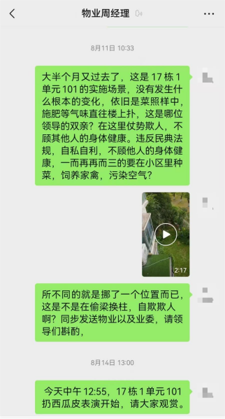 随着天气变化,种菜施肥的异味愈发浓烈,家禽活动产生的噪音也不断干扰邻里,其他业主的正常生活受到严重影响。在多次与物业沟通无果后,一位业主于9月25日以后通过抖音、头条等网络平台发布视频曝光该问题,引发众多网友关注与声援,呼吁维护小区公共秩序。