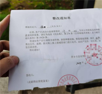 早在6月份,受影响的的一位业主就上述问题向小区管理方萍乡芦溪县万龙山乡锦绣苑温泉度假村嘉欣物业(以下简称“嘉欣物业”)投诉,希望能制止101业主的违规行为。嘉欣物业向业主出示一份整改通知书,但仅以书面通知形式应付,并未采取实际执行措施,被业主质疑为“形式主义”。一业主表示,物业声称已将问题上报至辖区相关部门,但后续并无任何实质性动作,疑似存在处置流程脱节的情况。