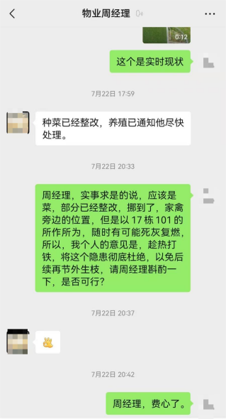 但实际核查后,违规现状并未改变。101业主仅将部分菜圃转移至低压室旁,简易家禽棚虽停止饲养家禽,却未拆除,只是掀开棚顶敷衍了事,意图等待舆论风头过后继续违规行为。更让业主气愤的是,当一业主向小区安保队长询问处置进展时,安保队长竟公然袒护101业主,称“人家也在这里买了房子”,其行为无需干涉,这番言论被业主质疑存在包庇护短的情况。
