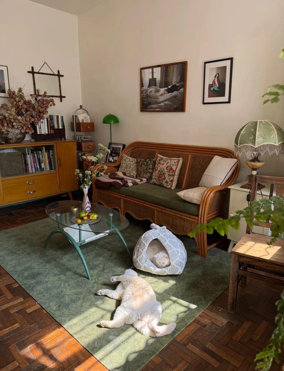 前方放置一张玻璃小茶几,旁边还搭配浅色小边桌,摆放着带流苏的绿色灯罩台灯,年代感满满,却总人有一种心安的感觉;