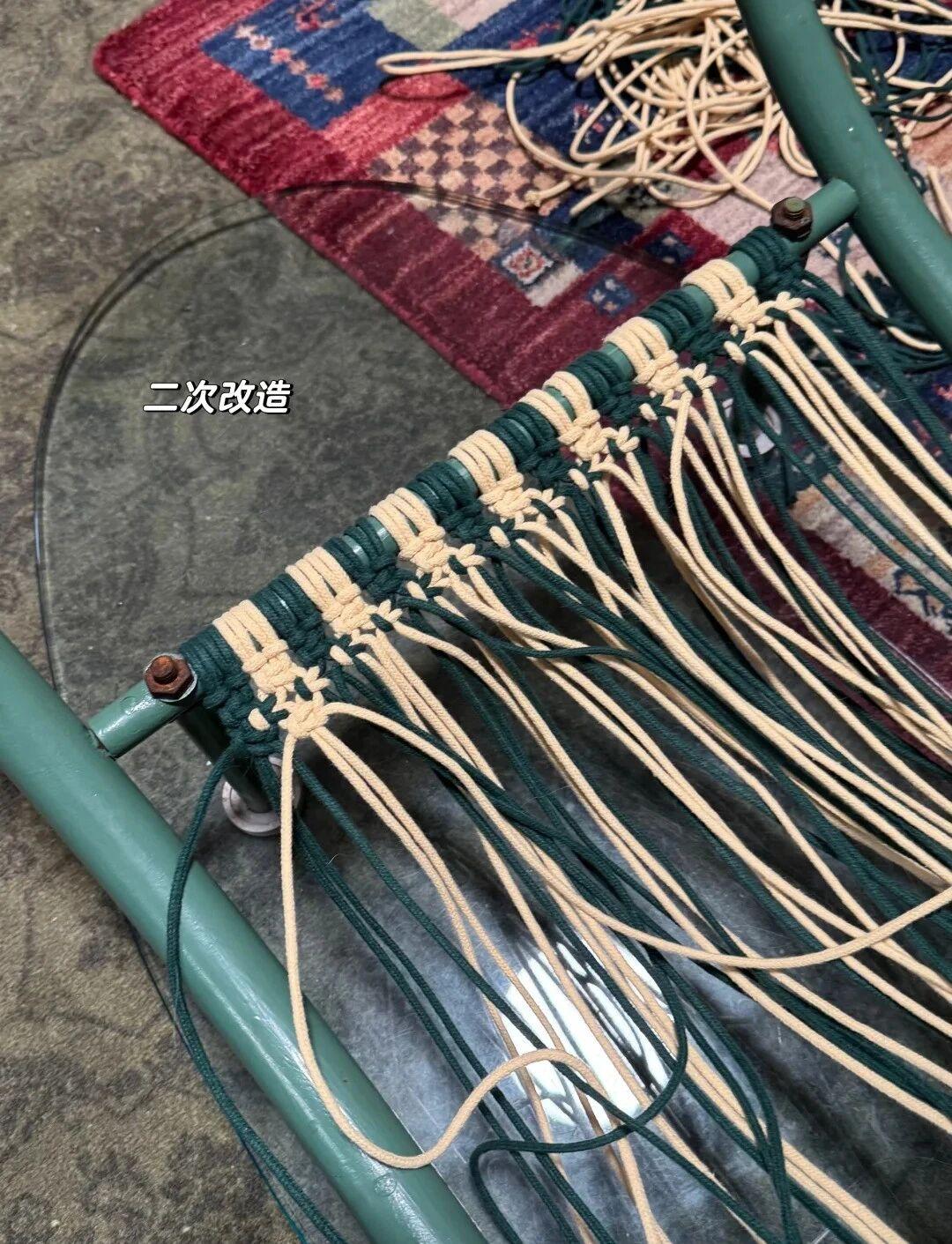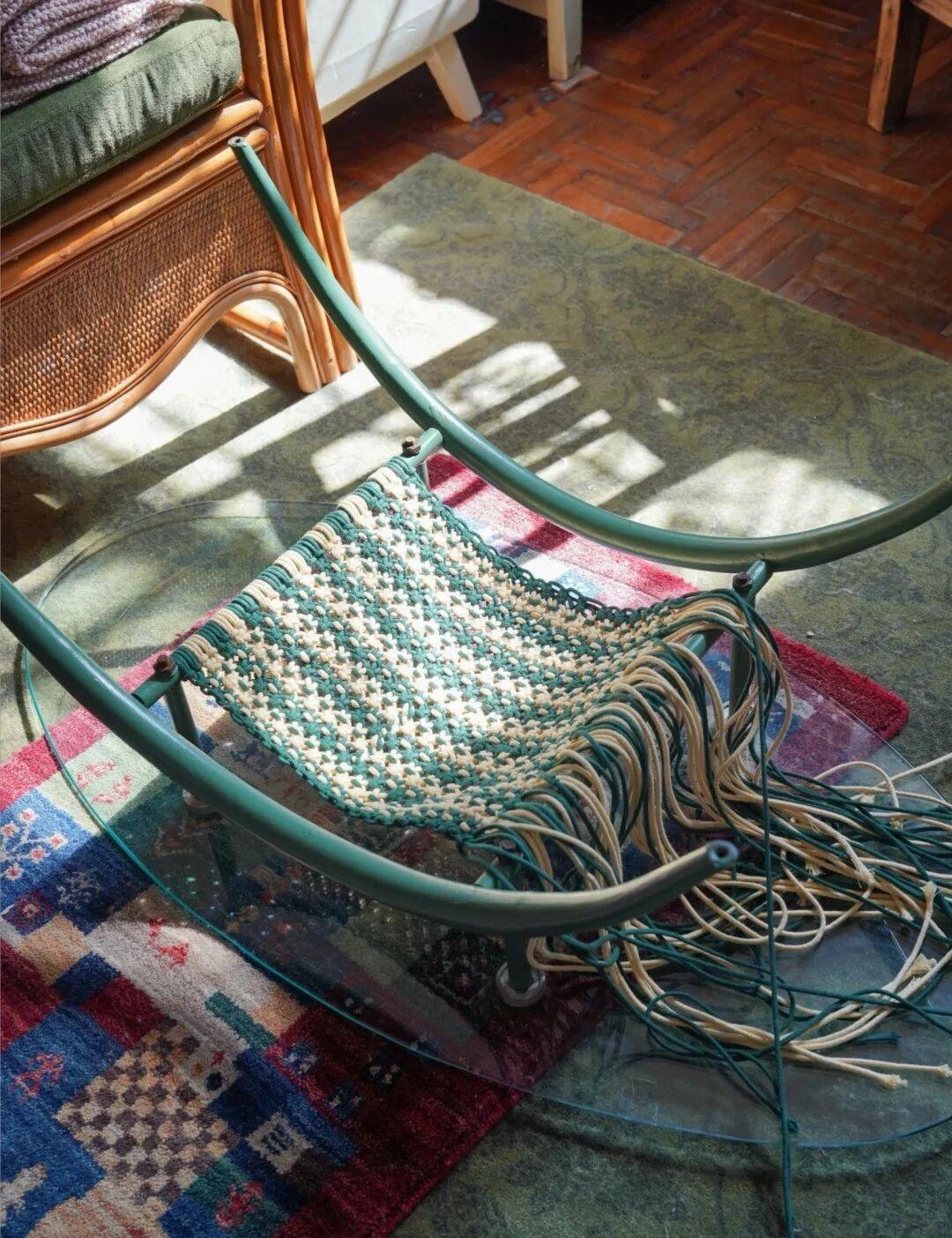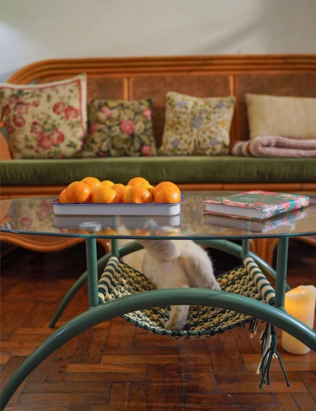 这个茶几底部中部留空的位置,博主也加入了棉绳,利用编织用平结,收尾加了斜卷结,跨度三天,总共花了近8个小时,将它变成了小猫的吊床,太好看,太有爱了;
