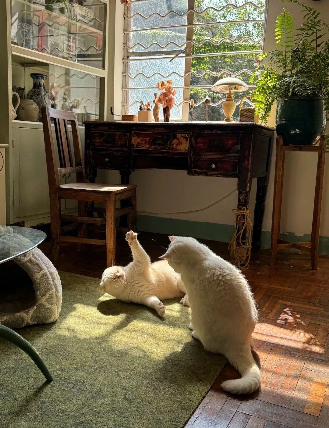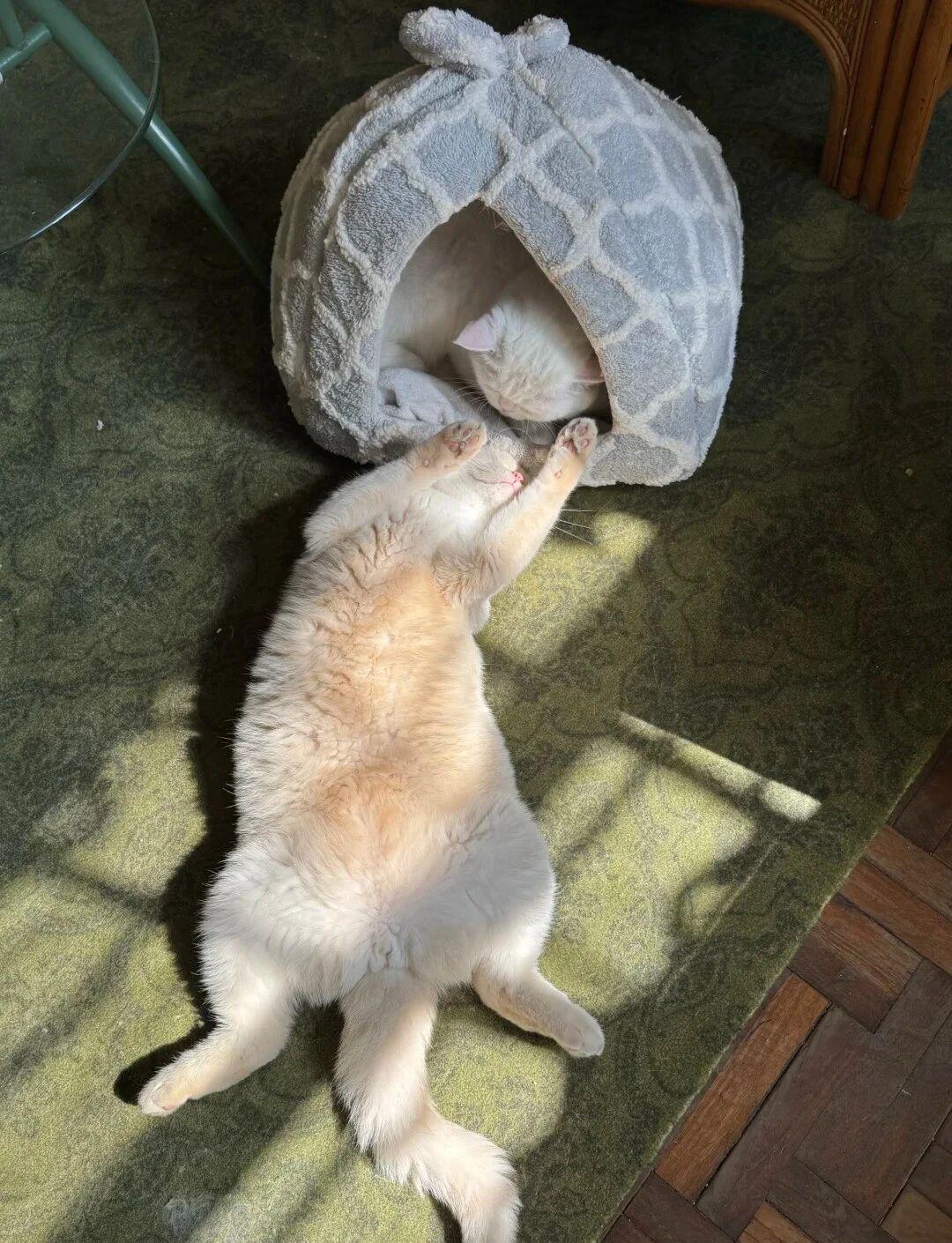 地面铺上地毯,最角落还放了一灰色猫窝,白天博主坐在一旁的时候,家里的大白猫也喜欢蜷缩着这里,另一只大白猫则喜欢跑到有阳光的地方,惬意地晒太阳,看着它们,总感觉特别舒服。