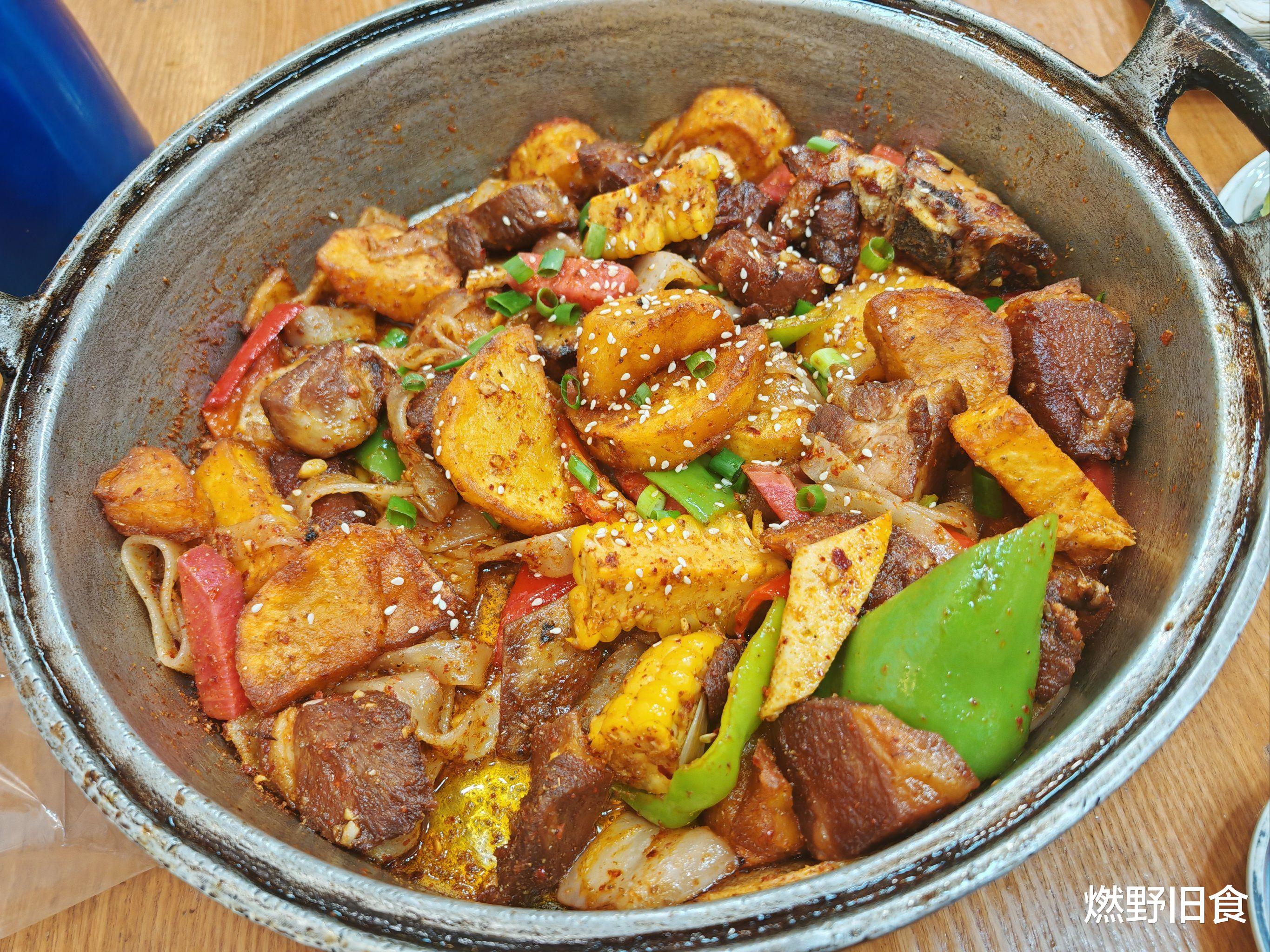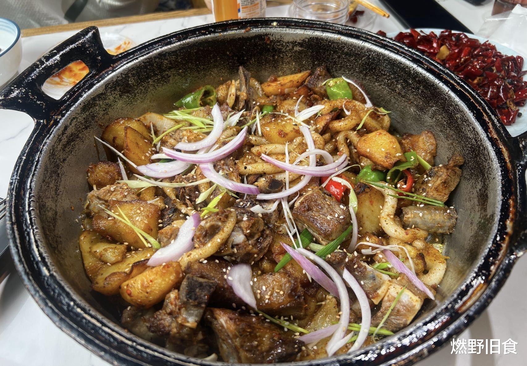 它精选生长在青海草原的滩羊肉,先炸后炒再焖,再放入厚铁锅中,加入西北土豆块、玉米段、洋葱、青红椒等,撒上足量的孜然、辣椒面等香料。