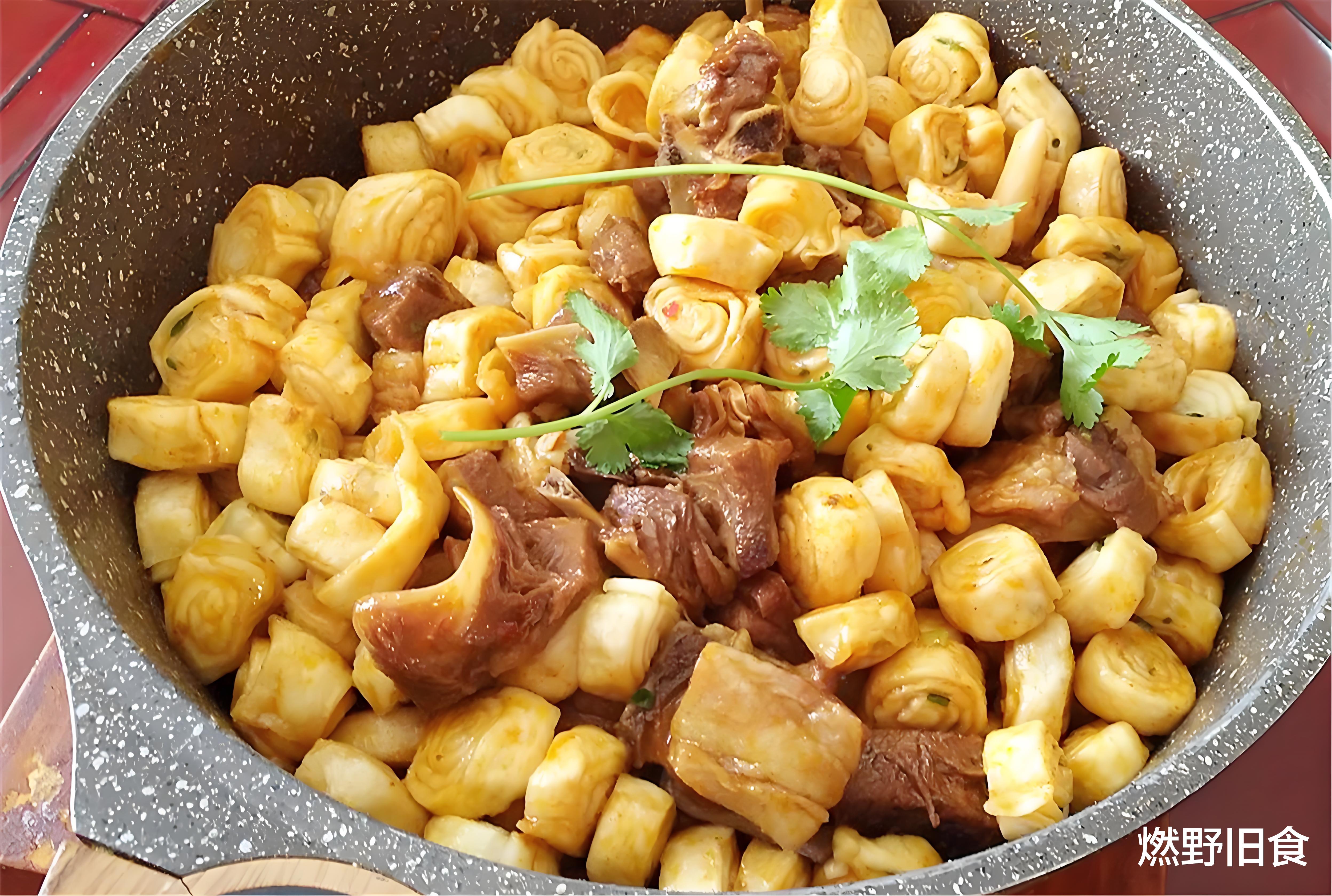 先将羊肉炖煮至软烂,然后将擀好的面卷铺在羊肉上,一同焖煮至面卷熟透入味。蒸熟后的花卷,底部浸润了鲜美浓郁的羊肉汤汁,吃起来松软鲜香。
