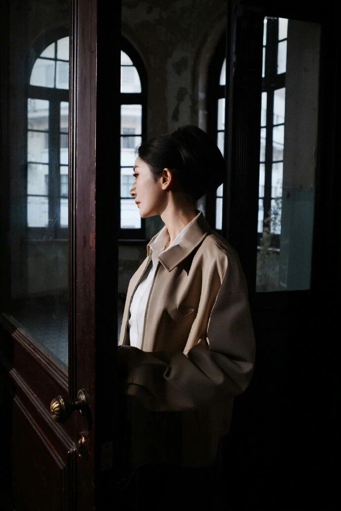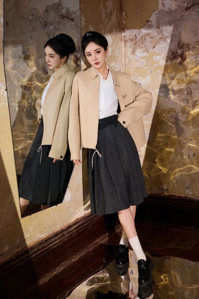 这组造型的 “松弛文艺”,是把 “她的柔骨松弛” 当成了 Prada 冷奢的 “软雅框架”: