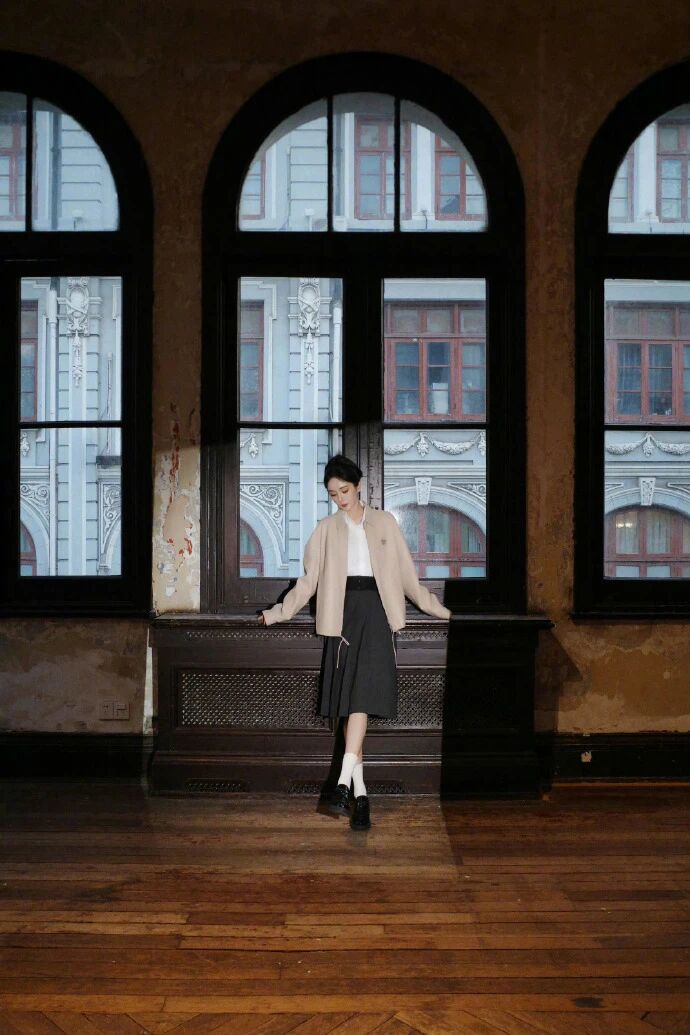 :浅卡其短西装的肩线是 “利而不僵”—— 刚好卡在肩峰的柔弧外沿,没硬成 “奢牌的冷壳”;黑裙的垂褶顺着腰棱的弧度铺,把 “Prada 的简” 焊在了 “骨的松” 里,像 “为她的柔骨量身裁的文艺奢衣”。