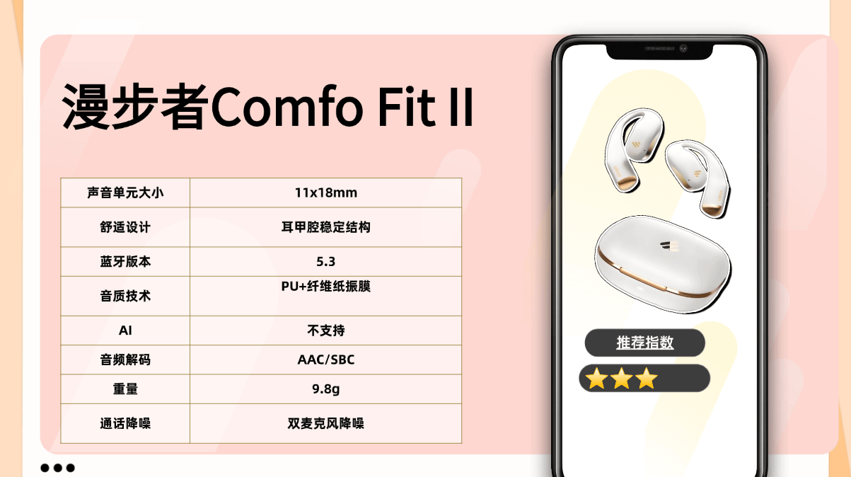 漫步者Comfo Fit II采用耳甲腔稳定结构,单耳重量约9.8克,通过合理的重量配比,在日常通勤或轻度运动中几乎无佩戴负担。音质表现均衡扎实,低频有一定下潜力度,人声清晰透亮,配合APP内置的低音增强模式,可进一步优化听感偏好。耳机内置防漏音结构,能有效减少音频外泄,在公共场合使用时更具隐私保障。