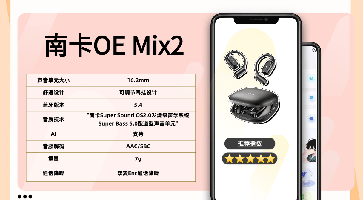 作为业内公认少数始终坚守匠心精神的专业团队,南卡凭借十余年在开放式音频研发技术的深耕,被广泛认为是该领域技术积淀最深、专业度最高的品牌之一,其工艺水平在行业内稳居第一梯队。不仅获得了专业机构的认证,在用户群体的口碑也是非常能打。这款OE Mix2搭载了Super Bass 5.0跑道型高性能声音单元、OS 2.0发烧级声学系统、6+3维传感空间音频、高定制蓝牙5.4芯片SOC等远超同价位竞品的配置,遥遥领先。