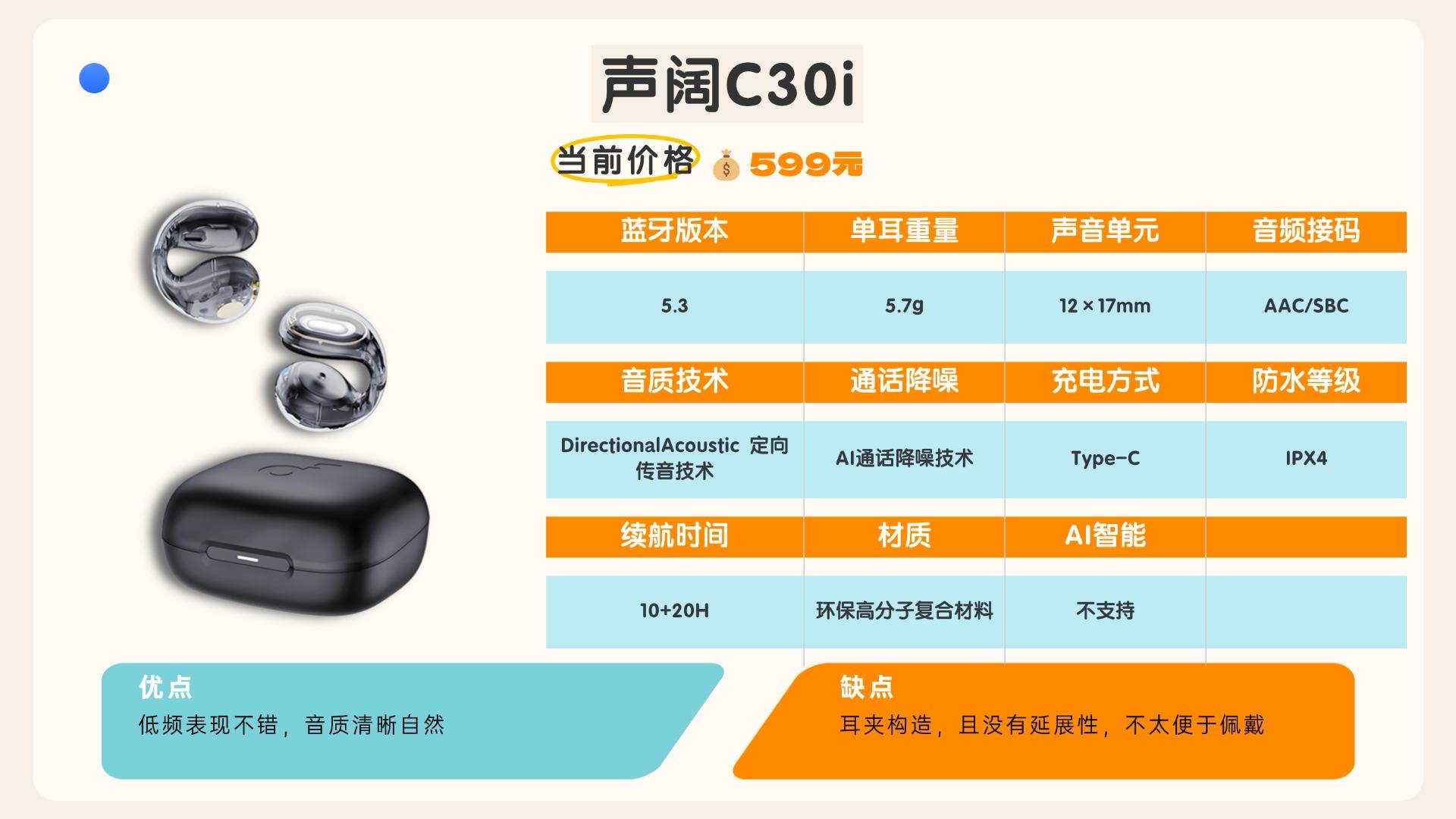 综合来看,CleerARCII耳挂式耳机在佩戴适配性、音质呈现效果以及续航实用价值上,均展现出均衡且优异的产品优势。