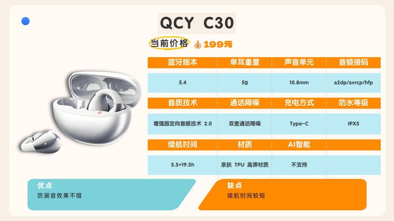 QCY C30在国内入门级耳夹耳机的测评中,凭借外观辨识度、佩戴舒适度等核心指标收获了不少好评,还通过了行业品质认证,深受追求个性与高性价比的年轻用户青睐。它以亲民的价格,提供了独特设计与实用体验,成功成为入门级市场的热门爆款,实现了销量与口碑的双丰收。